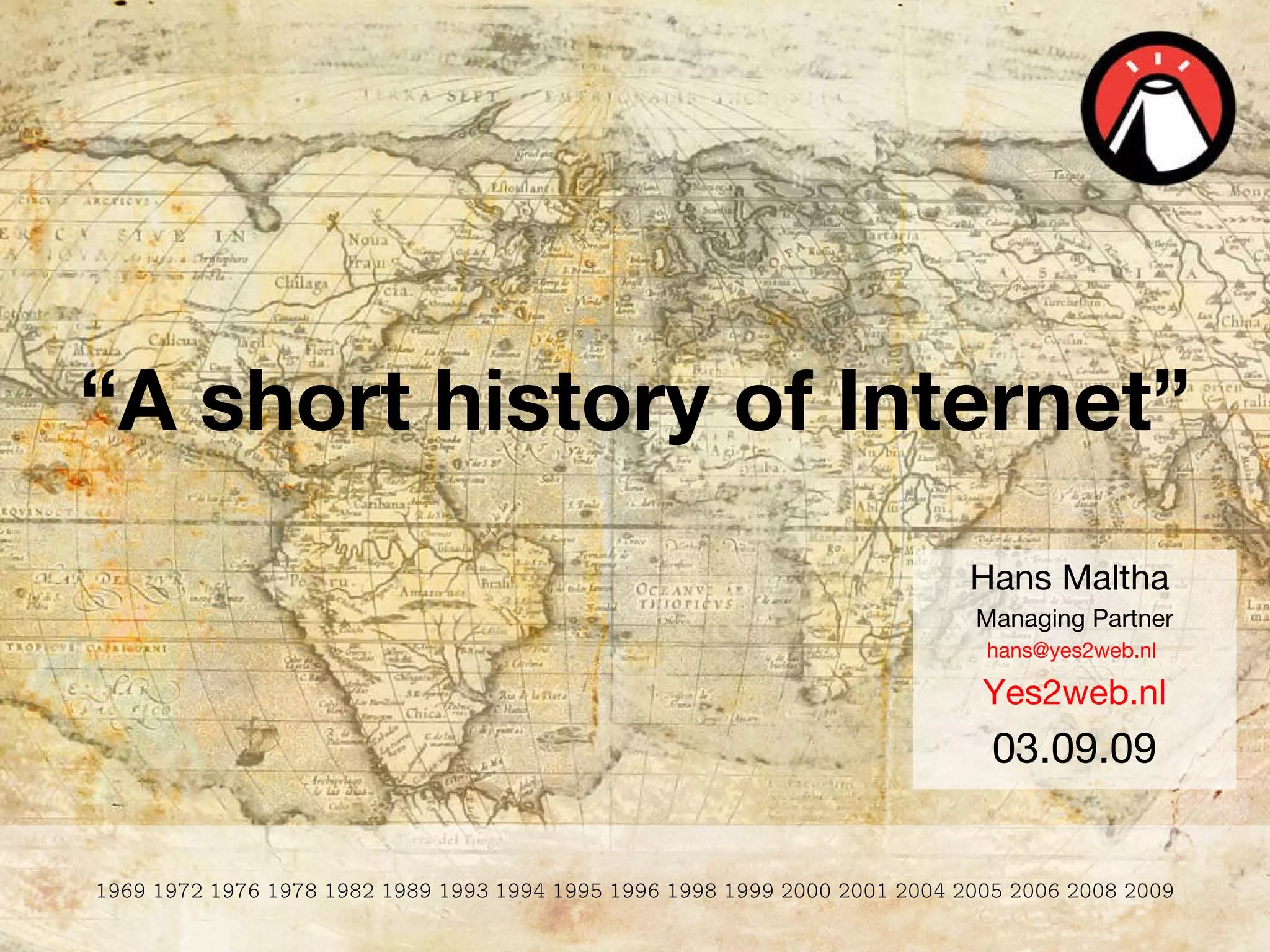 The document provides a brief history of the Internet from 1969 to 2009, highlighting several important milestones:
