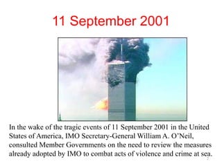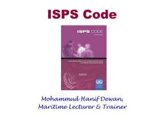 The ISPS Code is a comprehensive set of measures developed by the IMO to enhance maritime security. It was developed in response to terrorist attacks like 9/11 and the attack on the Limburg tanker. The ISPS Code has two parts - Part A which contains mandatory requirements for ships and port facilities, and Part B which contains guidance. Key elements of the ISPS Code include conducting vessel and facility security assessments to identify vulnerabilities, developing security plans, appointing security officers, controlling access to restricted areas, conducting drills and exercises, and setting security levels. Contracting governments are responsible for oversight of the ISPS Code and can authorize Recognized Security Organizations to assist with certain activities.
