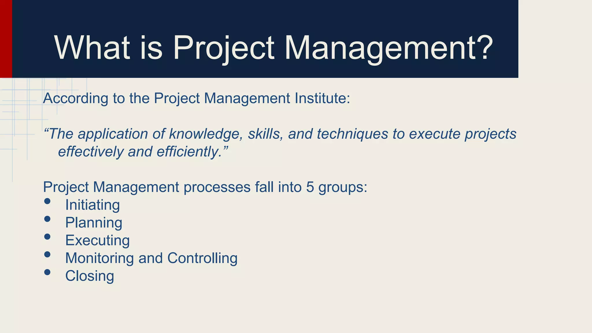 Project management involves applying knowledge, skills, and techniques to execute projects effectively through processes including initiating, planning, and closing. A project manager is responsible for all aspects of project management, ensuring tasks are completed and evaluated. The document outlines a workshop's purpose and includes key components of project planning and execution, such as defining scope and creating Gantt or PERT charts.