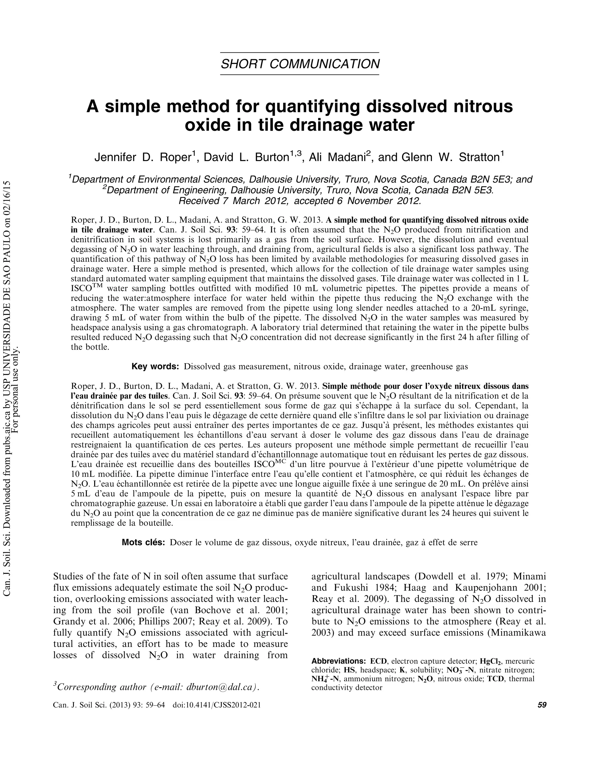 This document presents a simple method for quantifying dissolved nitrous oxide (N2O) in tile drainage water. Modified 10 mL volumetric pipettes placed inside standard 1 L water sampling bottles are used to collect tile drainage water samples while minimizing the water-atmosphere interface and reducing N2O exchange. Water is extracted from the pipettes using syringes for measurement of dissolved N2O concentration via headspace analysis using gas chromatography. Laboratory trials showed that retaining water samples in the pipettes reduced N2O degassing such that concentrations did not significantly decrease in the first 24 hours, allowing for automated collection and preservation of dissolved gas concentrations in drainage water.
