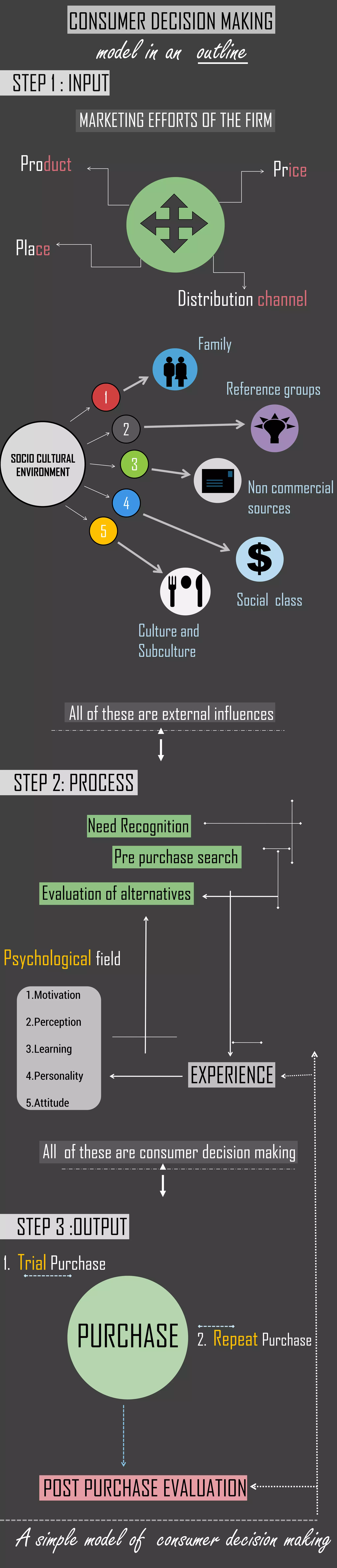 The document outlines a model of consumer decision-making consisting of three main steps: input, process, and output. It highlights various factors influencing consumer behavior, including socio-cultural influences and marketing efforts, that affect perception and evaluation of products. The final output includes trial purchases and repeat purchases after post-purchase evaluation.