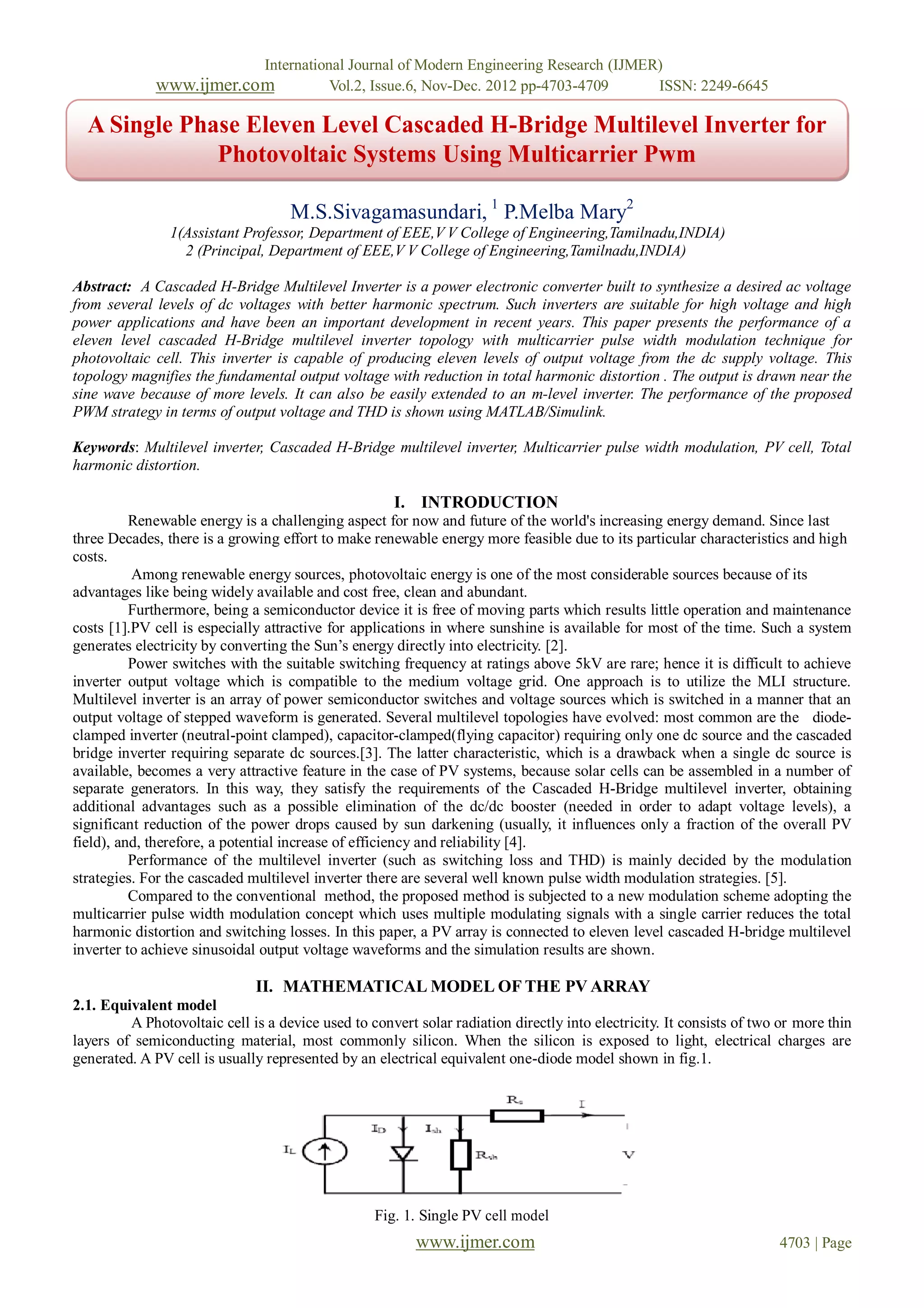 The document discusses the design and performance of an eleven-level cascaded H-bridge multilevel inverter specifically for photovoltaic systems, utilizing multicarrier pulse width modulation (PWM) to enhance output voltage and reduce total harmonic distortion. It emphasizes the inverter's capability to provide high voltage and power efficiency suitable for renewable energy applications, particularly solar energy. The results of simulations performed in MATLAB/Simulink demonstrate the effectiveness of the proposed inverter approach in achieving near-sine wave outputs and minimizing harmonic distortion.