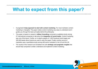 This paper outlines a practical six-step approach to implementing content marketing, emphasizing its importance in modern marketing strategies. Based on extensive research, including qualitative and quantitative studies, the document provides insights into drawing relevant content, maintaining customer relationships, and increasing social media reach to achieve business objectives. The steps cover content selection, conversion strategies, and effective planning to ensure that content is both shareable and impactful.