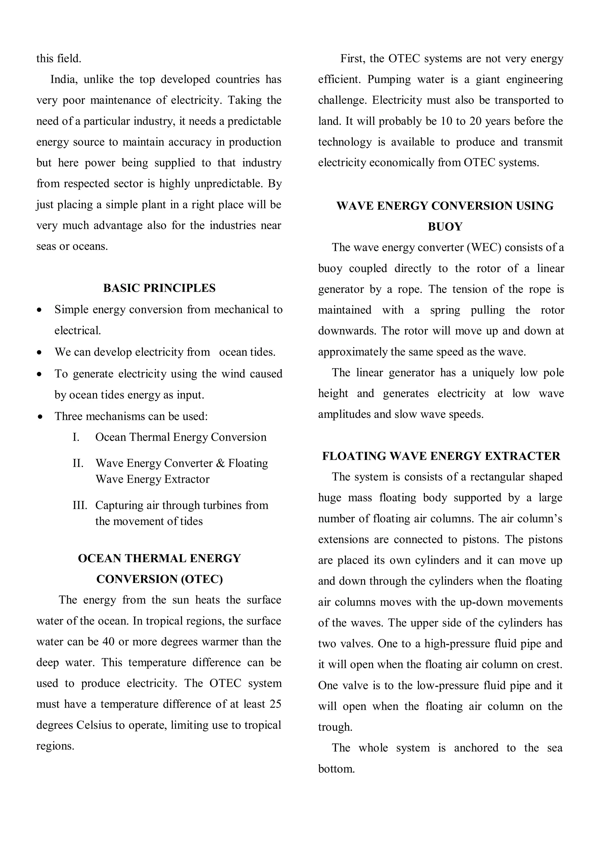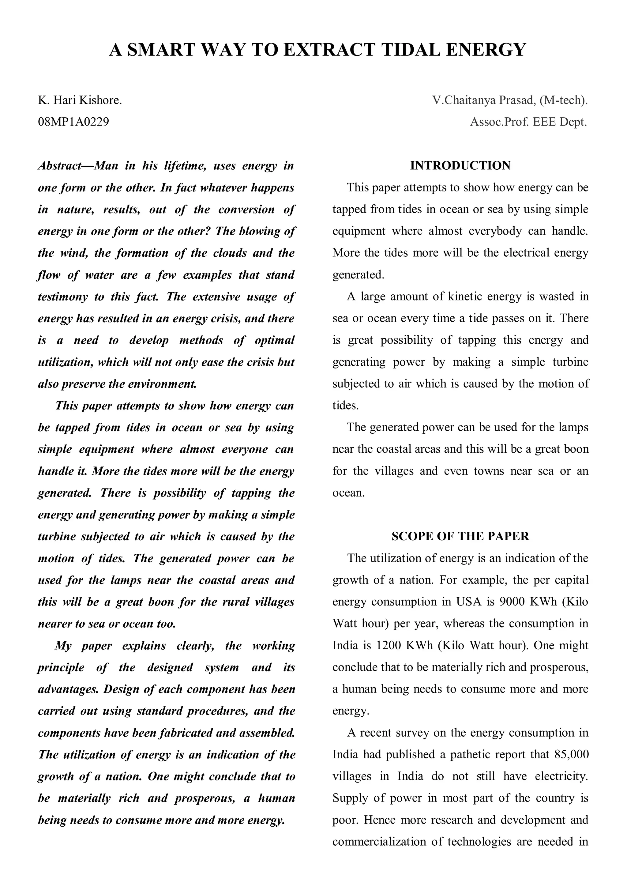 This document describes a simple method to extract tidal energy using a long barrel placed in the ocean. As tides rise and fall, they force air in and out of the barrel, spinning a turbine connected to a generator. Only a barrel, turbine, generator and placement site are needed. It can provide low-cost electricity to power street lights in coastal villages. The system captures free kinetic energy from tides rather than wasting it, meeting basic energy needs in a sustainable way.