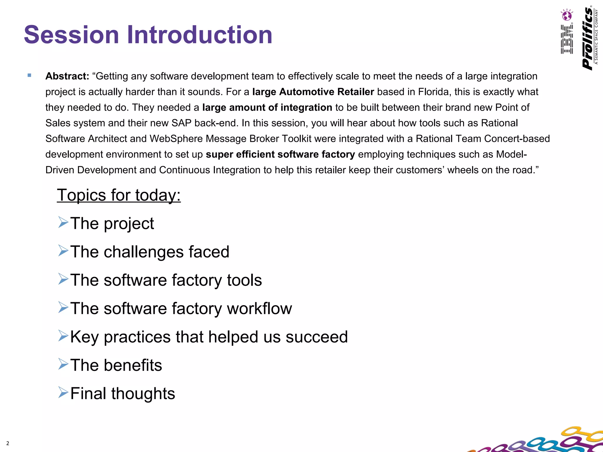 The document discusses a software factory integrating Rational and WebSphere tools to support a large integration project for an automotive retailer in Florida. It highlights the project's challenges, including coordination across a multi-vendor global team, and outlines software factory tools and workflows that facilitated efficient development through model-driven approaches and continuous integration. Ultimately, it emphasizes the importance of collaboration, architectural control, and automated processes to improve team efficiency and deliverable quality.