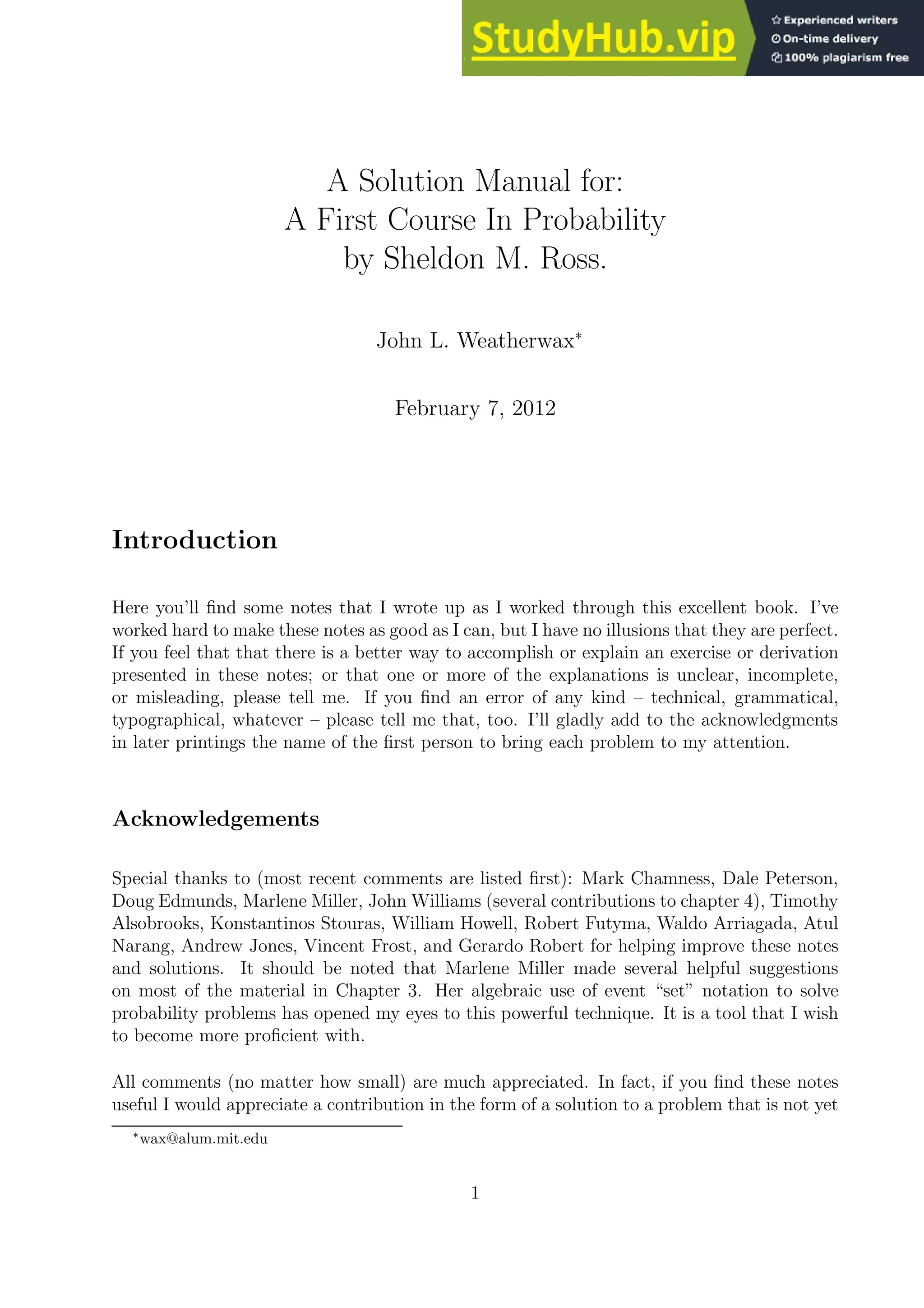This document provides a 3 sentence summary of a multi-page solution manual for "A First Course in Probability" by Sheldon M. Ross: