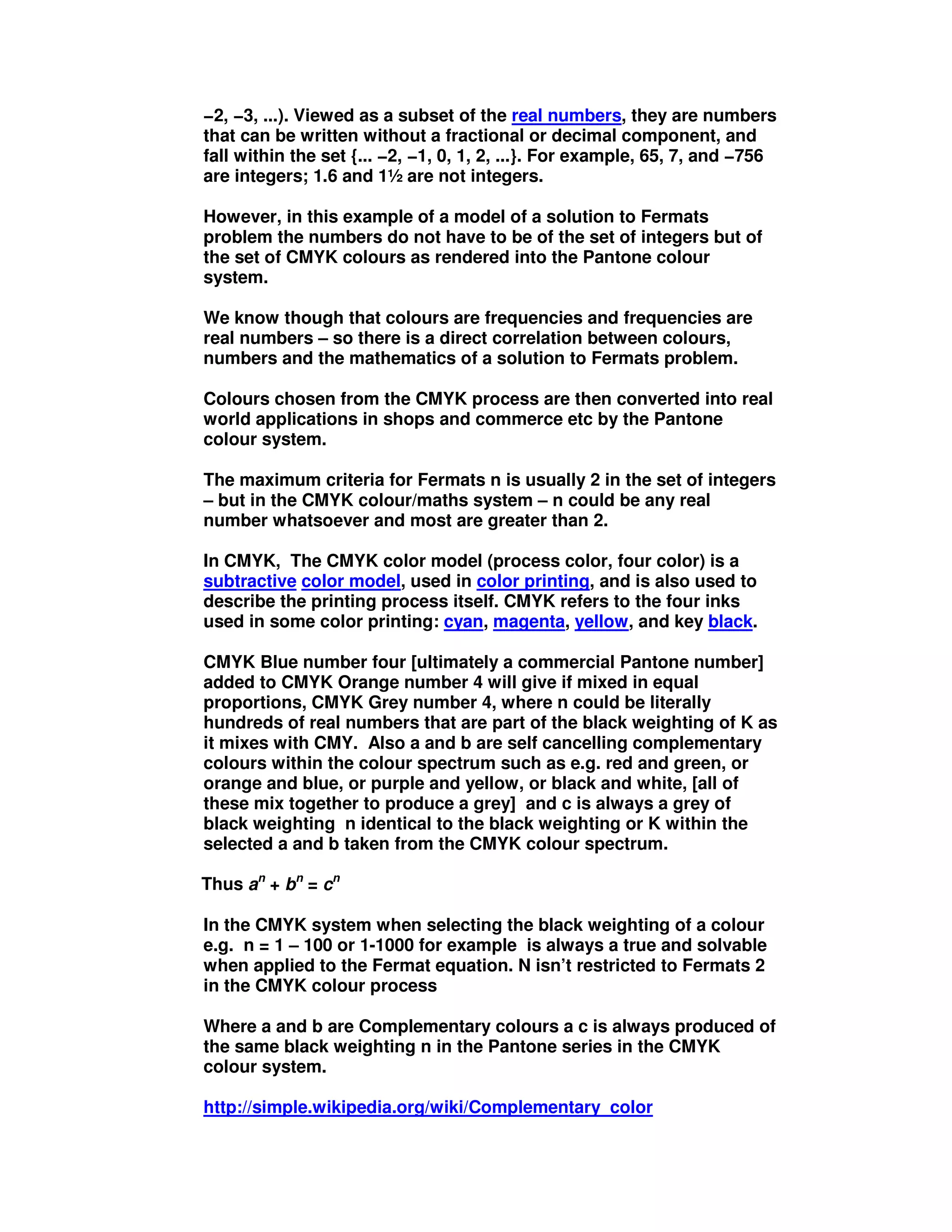 The document proposes a solution to Fermat's Last Theorem using a color analogy involving the CMYK color model. By treating colors as frequencies correlating to real numbers, the model asserts that the equation can be solved for any n greater than 2 through complementary colors. This approach presents a non-paradoxical interpretation of the theorem, suggesting a broader systems theory in mathematics and natural sciences.