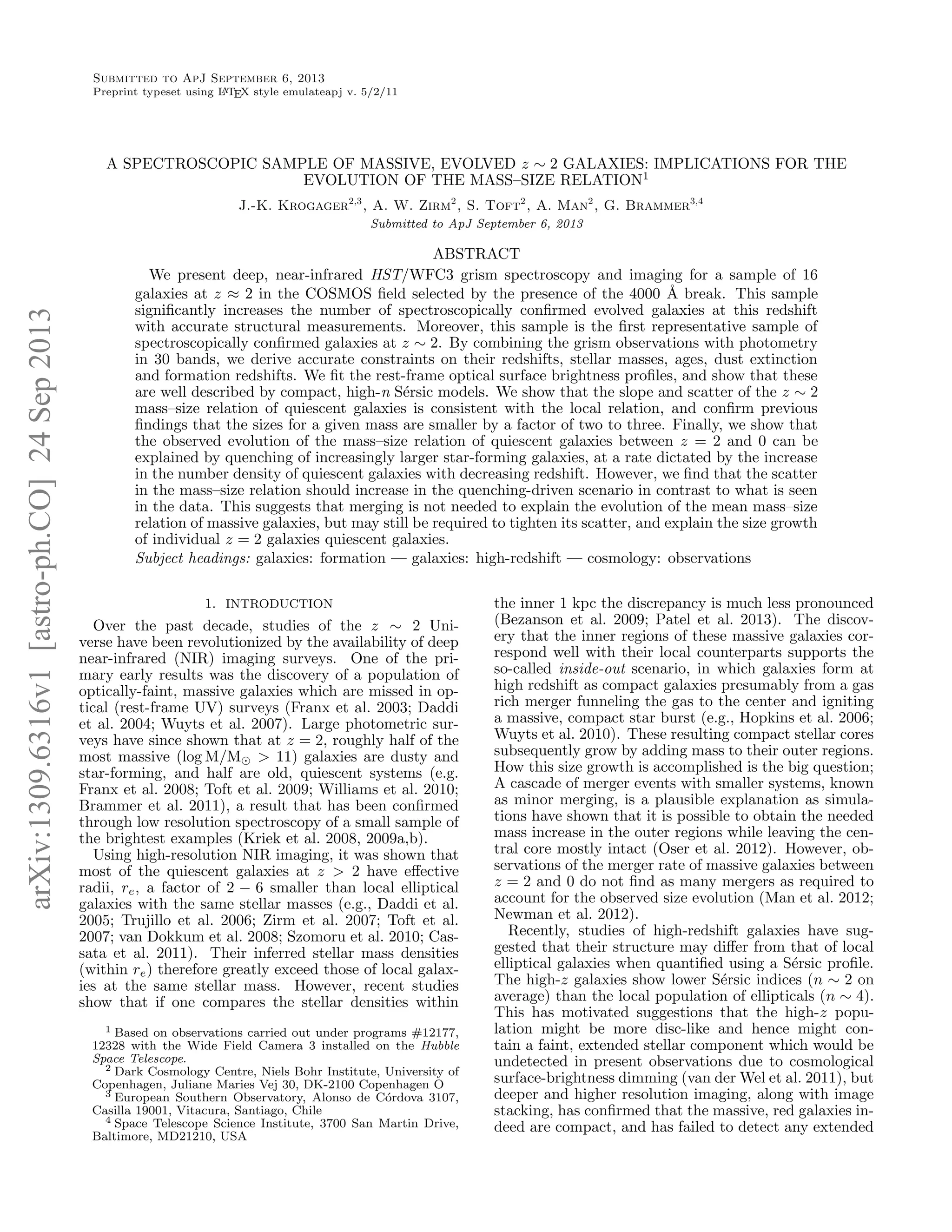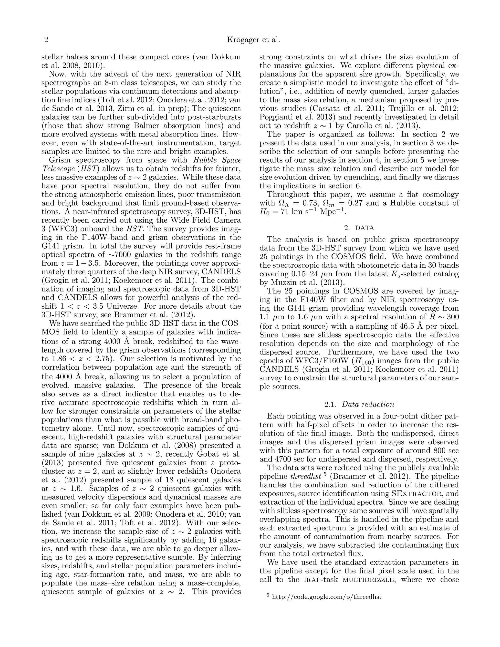 This document describes a study of 16 massive galaxies at z ~ 2 selected from the 3D-HST spectroscopic survey based on the detection of a strong 4000 Angstrom break in their spectra. Spectroscopy and imaging from HST/WFC3 are used to determine accurate redshifts, stellar population properties, and structural parameters. The sample significantly increases the number of spectroscopically confirmed evolved galaxies at z ~ 2 with robust size measurements. The analysis populates the mass-size relation and finds it is consistent with local relations but with smaller sizes by a factor of 2-3. A model is presented where the observed size evolution is explained by quenching of increasingly larger star-forming galaxies at a rate set by