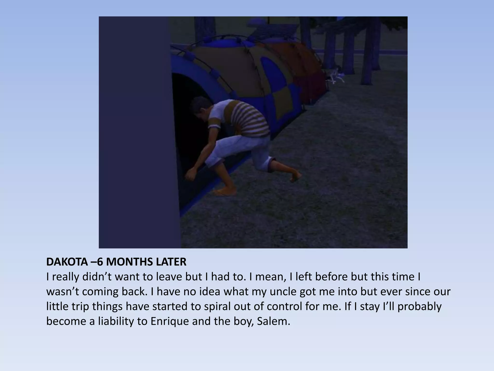 Dakota leaves Enrique's camp in the night without saying goodbye, feeling he has become a liability. Salem notices Dakota is missing and worries for him. A year later, Dakota is living peacefully in the forest with his wife Cara and newborn son Angel. He calls Enrique for the first time in over a year to share his new life. Meanwhile at Albert's house, Hailey unexpectedly gives birth to twins Fyre and Iyce, whom she claims to have farted out. At the Legacy house, Ethan and Fair have twins of their own, daughter Fiona and son Charming. Marylena dotes on her grandson Charming and continues to disapprove of Ethan. Sabrina