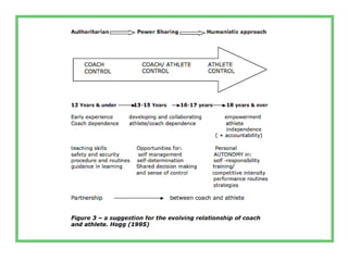 The document discusses the fundamentals of coaching, including enhancing athlete performance while enabling them to take responsibility for their performance, and continuing the coach's own development. It also covers balancing optimal performance, experience, and development for athletes. Coaching is characterized by uncertainty which can lead to emotional behaviors from human reaction, and has evolved from self-taught methods to certifications and professionalization. Key components of successful coaching are knowledge, observation, interpretation skills from experience, and the ability to inspire players.