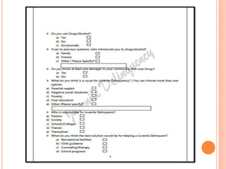 This document reports a statistical study on juvenile delinquency, outlining the causes and prevention strategies based on a survey of 22 respondents. Key findings indicate that parental neglect, lack of guidance, and negative social situations significantly contribute to delinquency, with counseling identified as the most effective intervention. The study also emphasizes the influence of peer interactions and the importance of supportive family environments in mitigating juvenile delinquency.