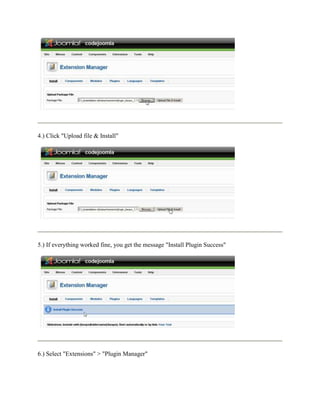This document provides step-by-step instructions for installing and using the bretteleben.de Simple Picture Slideshow Plugin for Joomla. It outlines the installation process, configuration options, and how to add images and call the slideshow in articles. Key steps include uploading images to the media library, configuring plugin settings like dimensions, effects, and controls, and using shortcodes to display slideshows on pages.