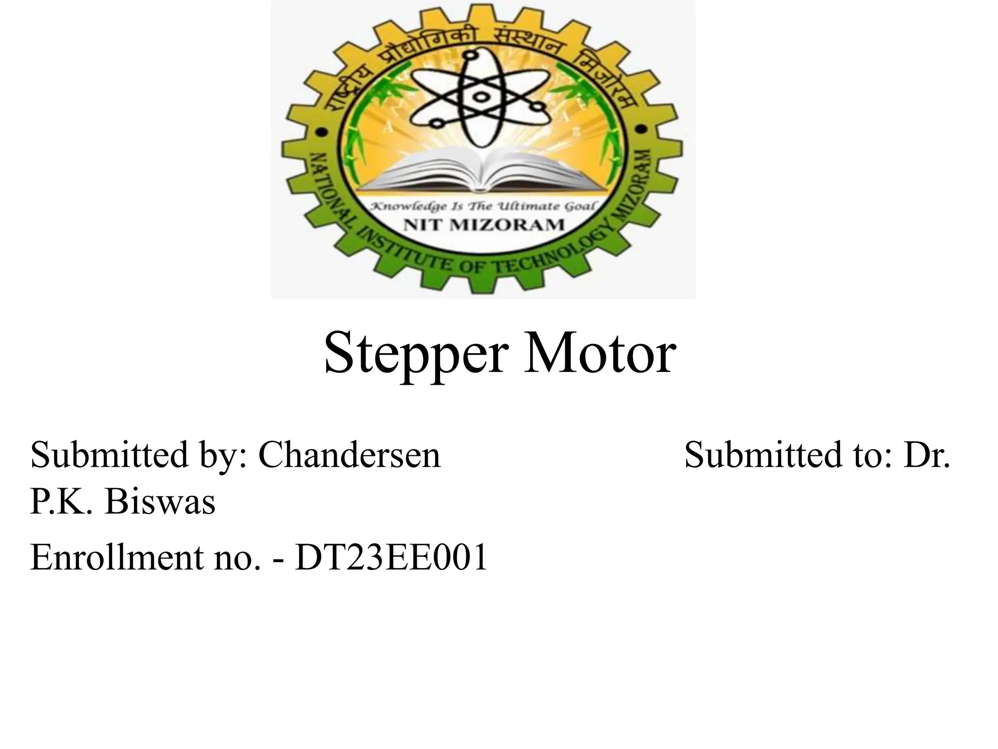 Stepper motors are used for precision position control. They rotate in discrete steps by energizing coils in a specific sequence without position sensors. There are three main types - permanent magnet, variable reluctance, and hybrid stepper motors. Permanent magnet steppers have strong torque but lower speed/resolution, while variable reluctance steppers have higher speed/resolution but lower torque. Hybrid steppers combine benefits of both for high performance. Full, half, and wave drive modes determine step angle and sequence of coil energization. Bipolar steppers use entire windings bidirectionally, while unipolar steppers have center taps for unidirectional current flow.