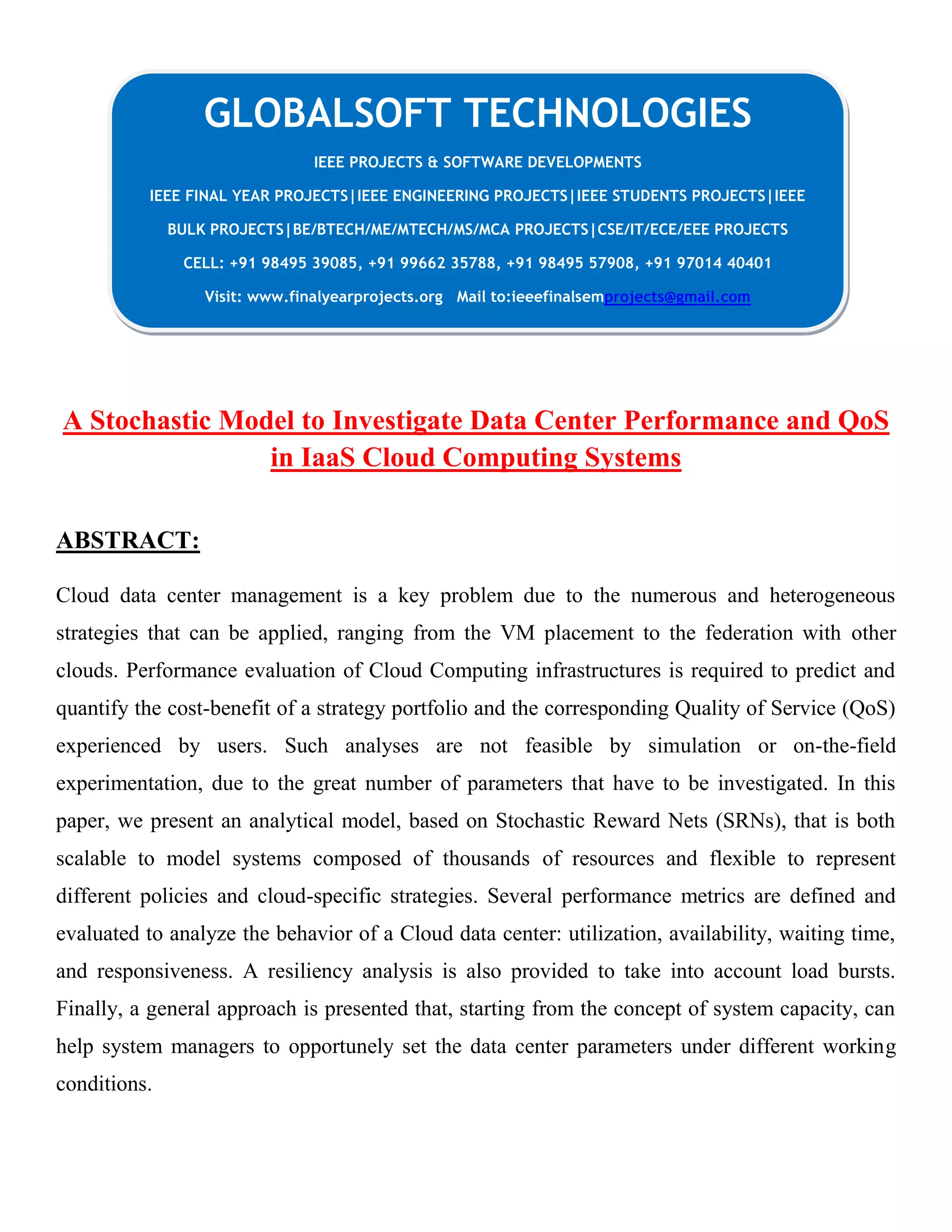 This document presents a stochastic model utilizing Stochastic Reward Nets (SRNs) for evaluating data center performance and quality of service (QoS) in IaaS cloud computing systems. The model addresses the challenges associated with existing experimental and simulation approaches, allowing for scalable analysis of thousands of cloud resources and flexible integration of various strategies. It emphasizes performance metrics such as utilization, availability, and responsiveness, enabling system managers to optimize data center parameters effectively.
