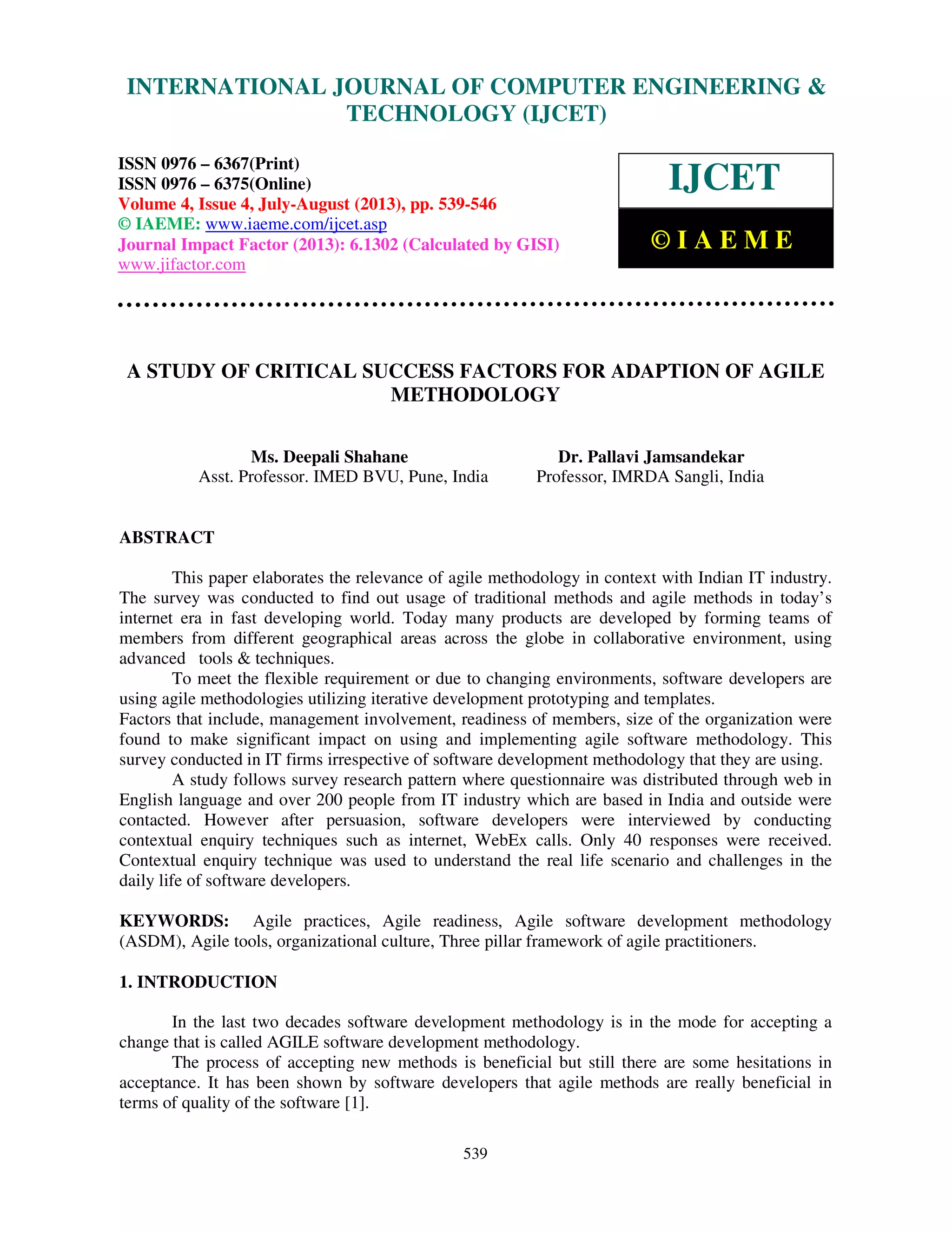 This document discusses critical success factors for adopting agile methodology. It conducted a survey of 200 IT professionals, though only 40 responded. The survey found that management involvement, team member readiness, and organization size significantly impact adopting agile software methodology. The document also reviews various agile methods like extreme programming, scrum, crystal and feature driven development, and compares them to traditional waterfall methods. It notes advantages of agile include short cycles, test-first development, and empowering teams, while waterfalls struggle with changing requirements.