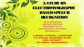This document summarizes a study on electromyography (EMG)-based speech recognition using silent speech interface (SSI). EMG detects muscle cell electric potentials during activation. The study examines techniques for each stage of speech recognition and compares matching techniques. SSI uses EMG sensors on the face to record muscle signals during speech, which are converted to electric pulses and translated to speech without sound. Future prospects include incorporating EMG electrodes directly into systems and adding lip reading and translation to more languages.