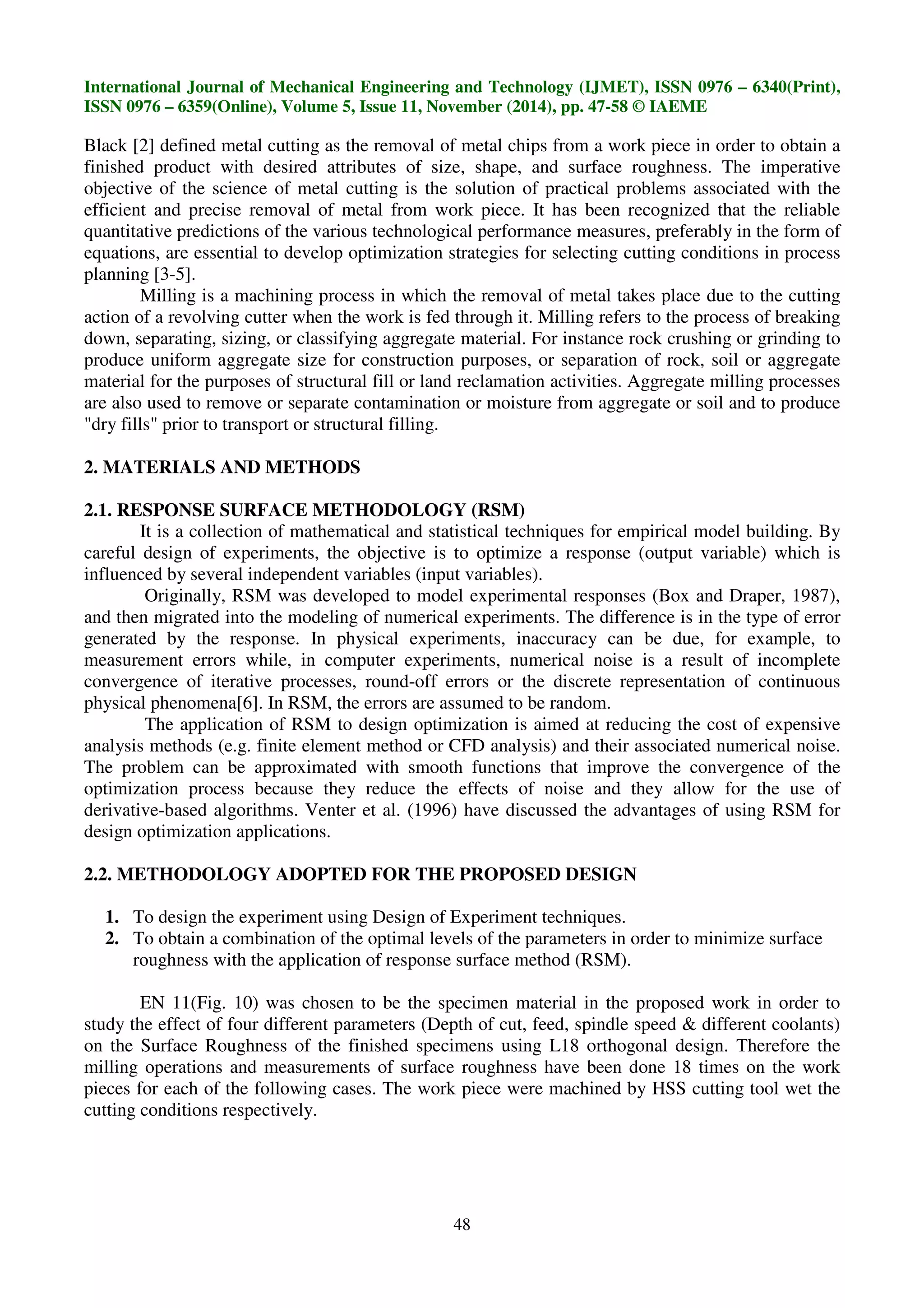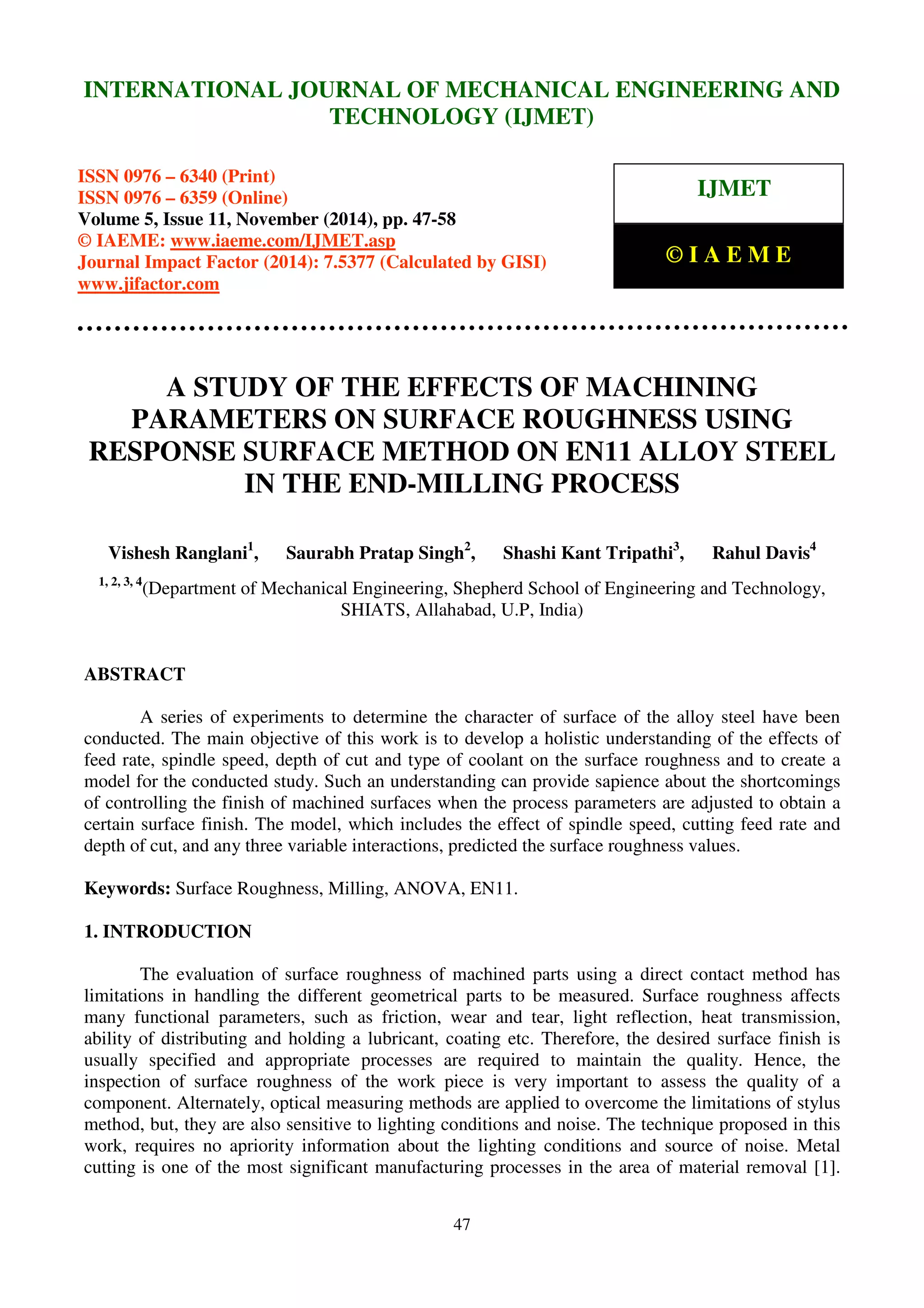 This document summarizes a study that investigated the effects of machining parameters on surface roughness in end milling of EN11 alloy steel. Experiments were conducted using an L18 orthogonal array to test combinations of depth of cut, feed rate, spindle speed, and coolant. Surface roughness was measured for each test and analyzed using response surface methodology. The results showed that machining parameters significantly affected surface roughness and statistical models could be developed to optimize the parameters to achieve a desired surface finish.
