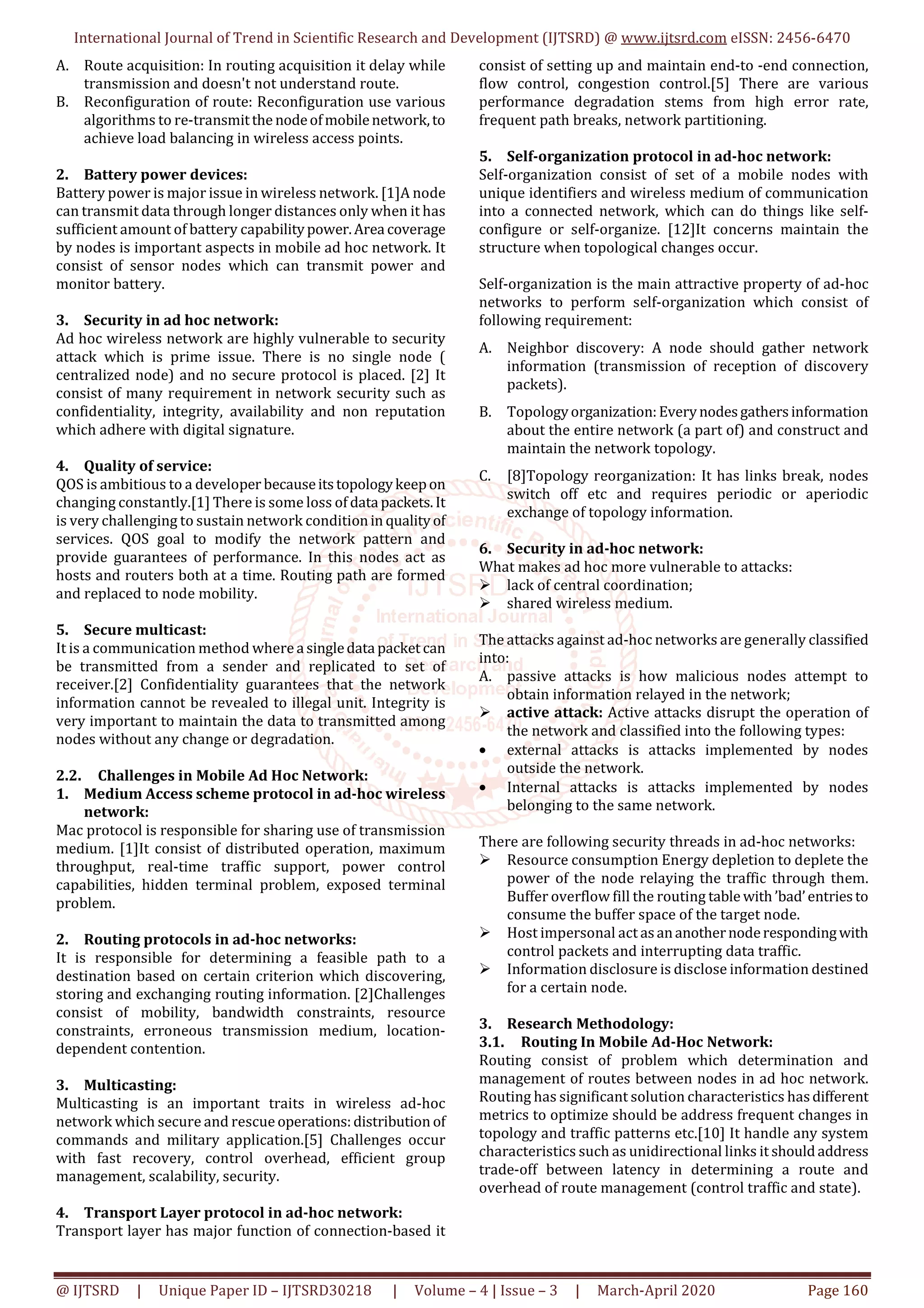 The document discusses routing techniques and challenges in mobile ad-hoc networks (MANETs). It begins by defining MANETs as infrastructure-less, self-configuring networks of mobile devices connected wirelessly without centralized administration. It then examines routing protocols in MANETs, classifying them as proactive (table-driven), reactive (on-demand), or hybrid. Key challenges discussed include frequent changes in network topology, security issues due to the lack of centralized control, and resource constraints of battery-powered mobile devices. The document concludes that MANETs have potential for wireless communication where infrastructure is not available or reliable.