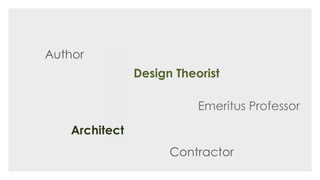Christopher Alexander was an influential architect, design theorist, and emeritus professor known for his works on architectural patterns and the nature of order in built environments. He was born in Vienna, Austria and received degrees from Cambridge University and Harvard University. Alexander authored several seminal books on architecture and design and designed over 100 buildings. His philosophy focused on creating living structures through 15 properties including strong centers, boundaries, graded variation, and inner calm. He argued cities develop in a more organic "lattice" structure than a compartmentalized "tree" structure and should allow for mixed functions and connectivity between areas.