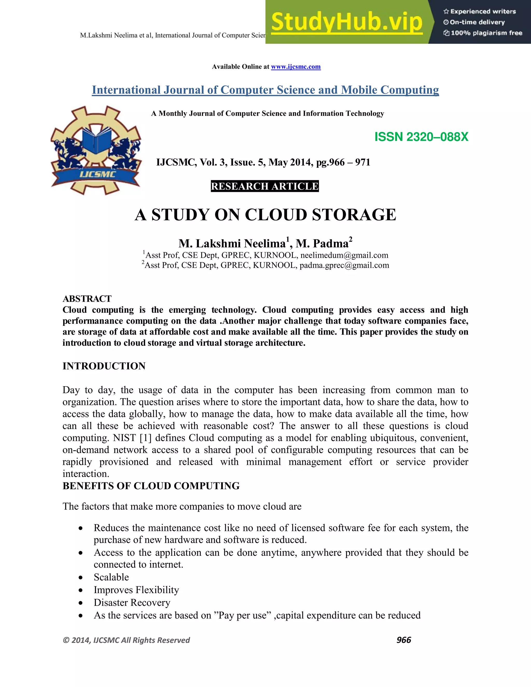 This document summarizes a research article that studies cloud storage. It begins by defining cloud computing and noting that cloud storage provides easy access to data at an affordable cost. The article then discusses different cloud service models including Software as a Service (SaaS), Platform as a Service (PaaS), and Infrastructure as a Service (IaaS). It also covers cloud deployment models and the benefits of cloud computing such as reduced costs and improved flexibility. The article focuses on cloud storage, describing common cloud storage providers and standards. It provides an overview of general cloud storage architecture and virtual storage architecture. Finally, the article concludes that cloud storage provides advantages over traditional storage through availability, scalability, and portability.