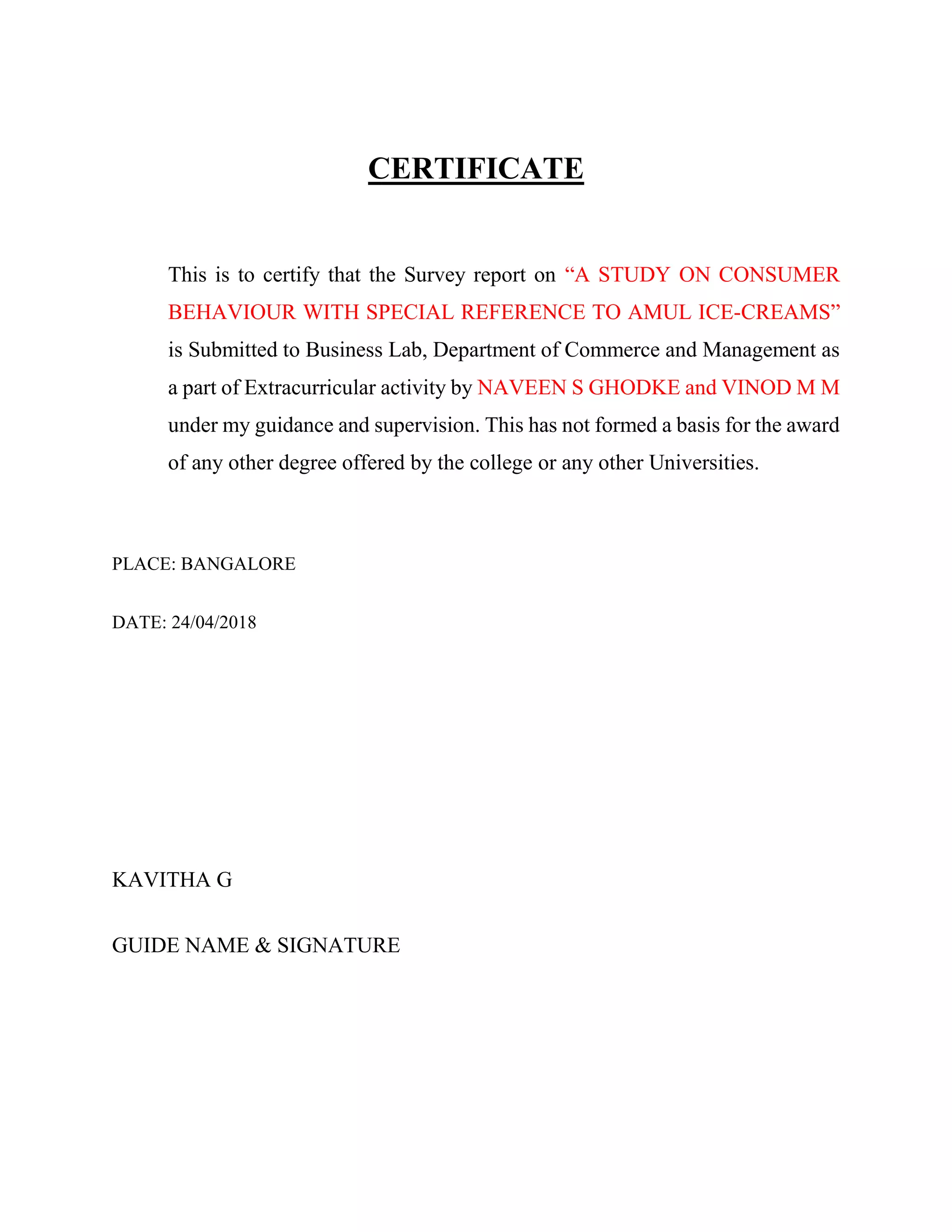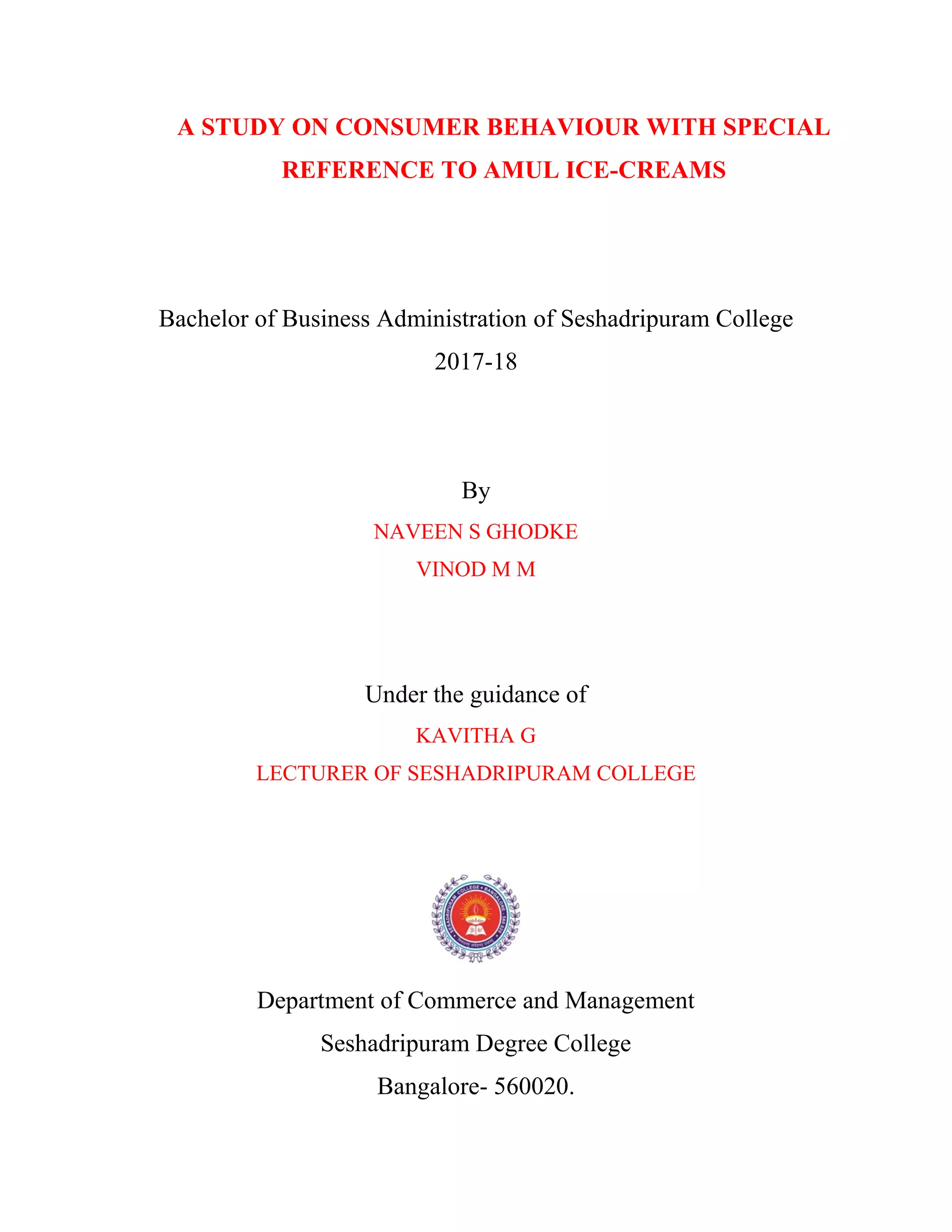 The document is a study on consumer behavior regarding Amul ice creams conducted by students Naveen S. Ghodke and Vinod M.M. at Seshadripuram College during the 2017-18 academic year. The study covers various aspects of consumer preferences, including flavor choices, frequency of purchase, and satisfaction levels, indicating that most respondents prefer chocolate flavor and value quality. Overall, the findings suggest a positive market presence for Amul ice creams, emphasizing the importance of consumer satisfaction and potential areas for improvement in marketing strategies.