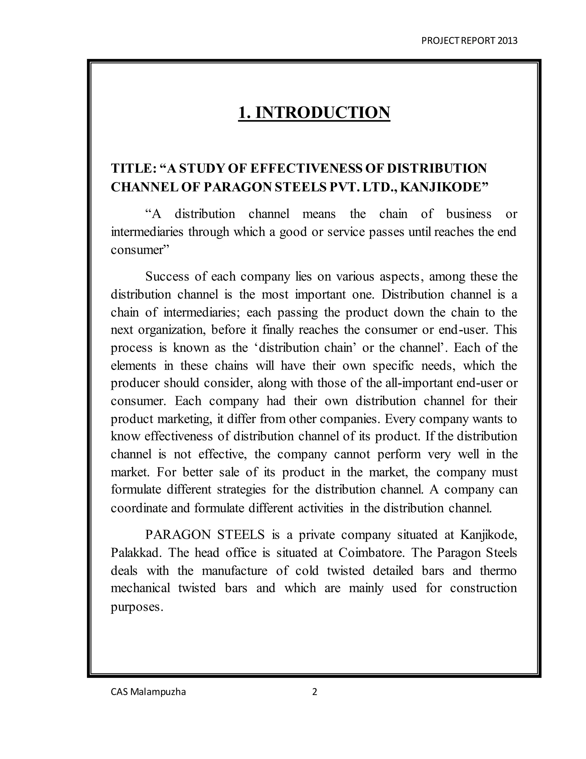 The document discusses the effectiveness of the distribution channel of Paragon Steels Pvt Ltd, an Indian steel manufacturing company. It provides an overview of the company's profile, manufacturing process, marketing department, and objectives. It also reviews literature on different types of distribution channels and factors to consider when selecting a distribution channel.
