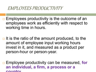 This document discusses a study on employee productivity conducted at Neyveli Lignite Corporation Ltd, focusing on measuring and improving productivity through various techniques and methodologies. It highlights key factors affecting productivity, such as communication, work conditions, and employee satisfaction, while emphasizing the need for effective management practices. The findings suggest that enhancing employee engagement and optimizing working conditions can significantly boost productivity levels without increasing working hours.