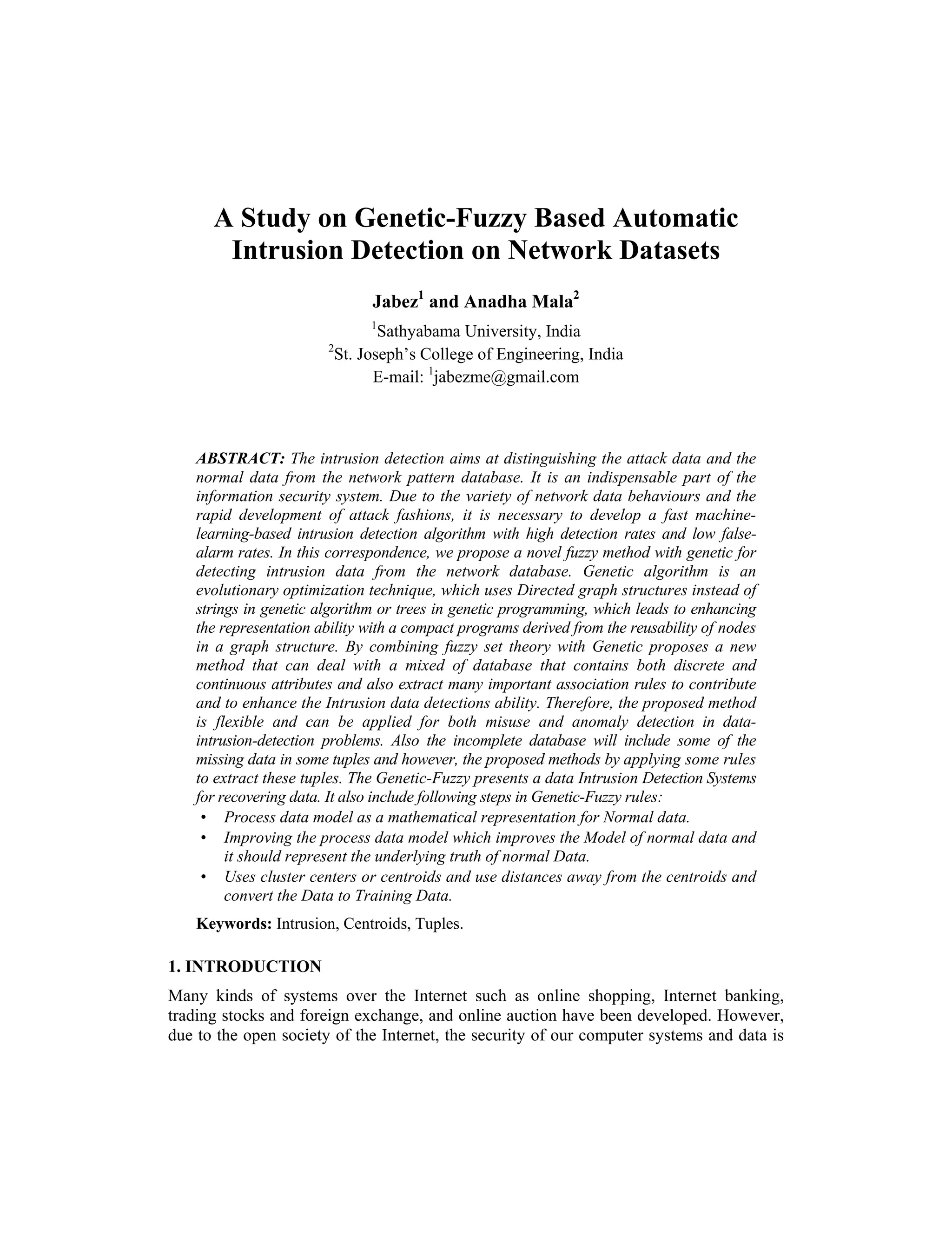 1. The document proposes a genetic-fuzzy based method for automatic intrusion detection using network datasets. It combines fuzzy set theory with genetic algorithms to extract rules for both discrete and continuous attributes to detect normal and intrusion patterns.