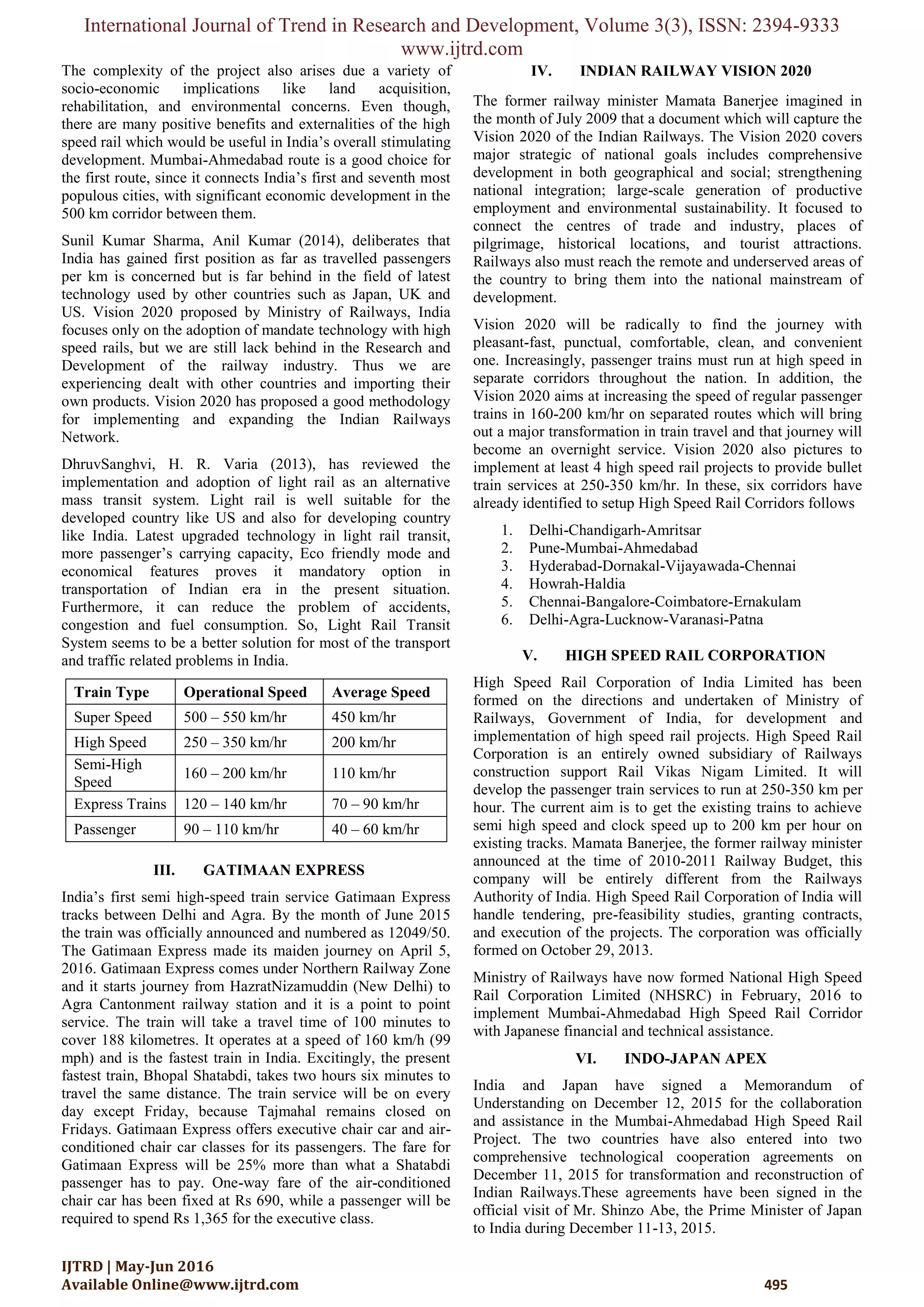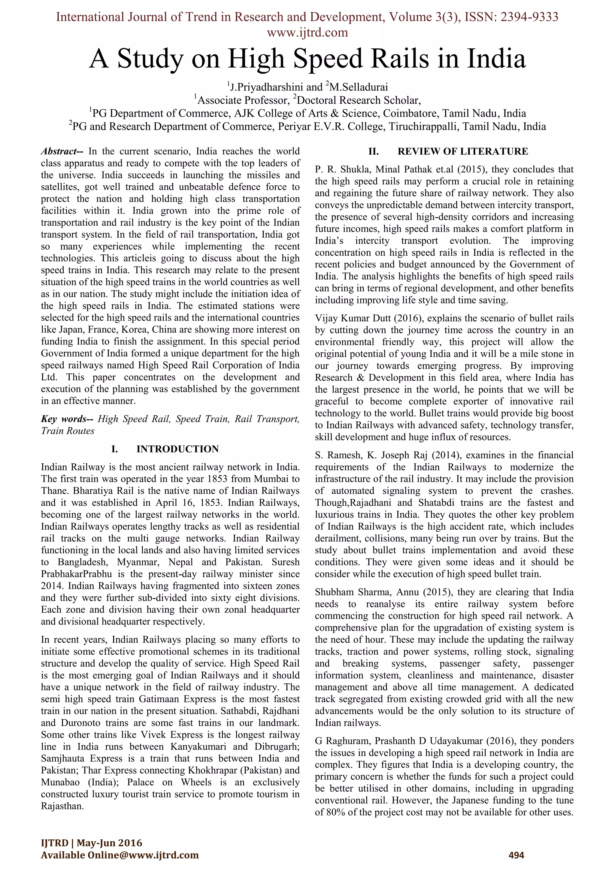 The document discusses the development of high-speed rail in India, highlighting its significance in the country's transportation infrastructure and detailing plans and collaborations with international partners like Japan. It covers the historical context of Indian railways, the introduction of semi-high-speed trains like the Gatimaan Express, and outlines future initiatives such as the Mumbai-Ahmedabad high-speed corridor. Additionally, it emphasizes the need for extensive planning, financial investment, and the potential socio-economic impacts of adopting high-speed rails in India.