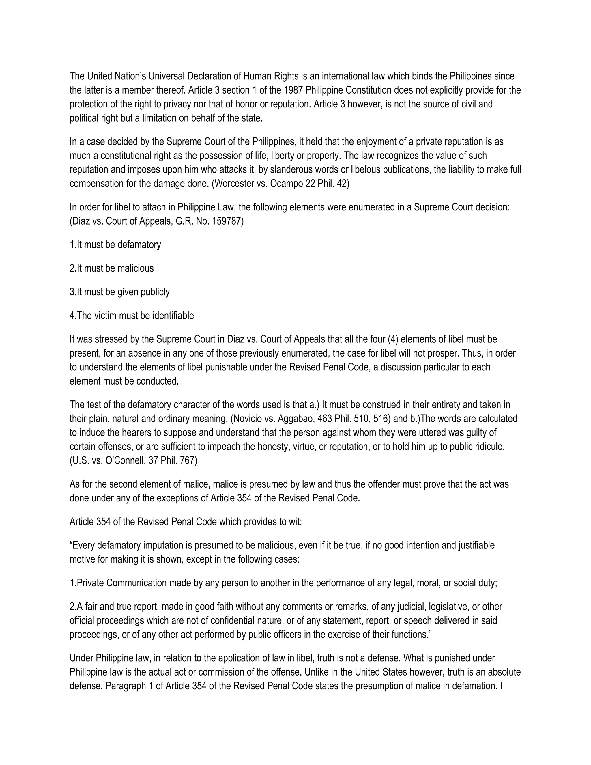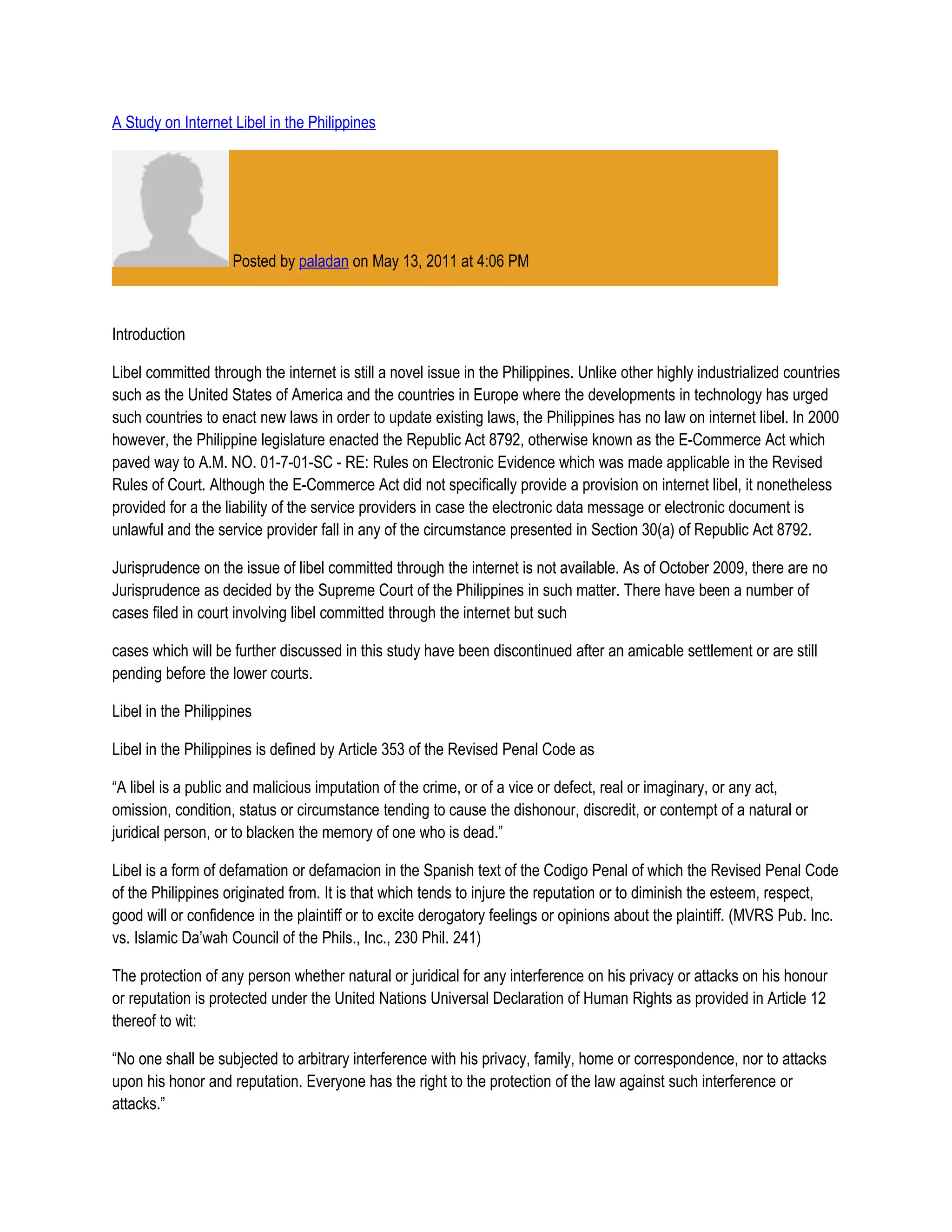 1) The Philippines has no specific law on internet libel, but libel committed through any "similar means" to those outlined in Article 355 could apply, including the internet.