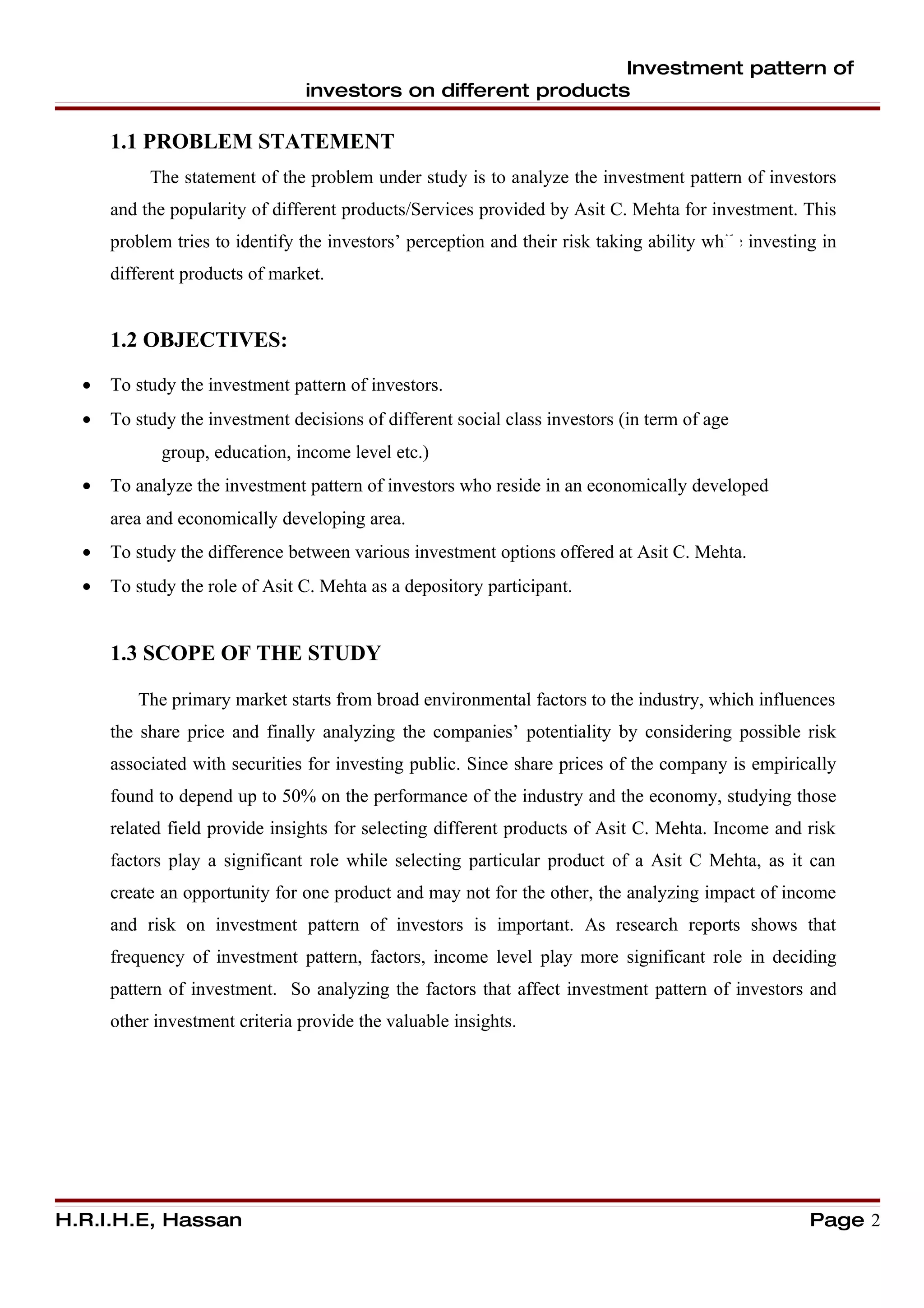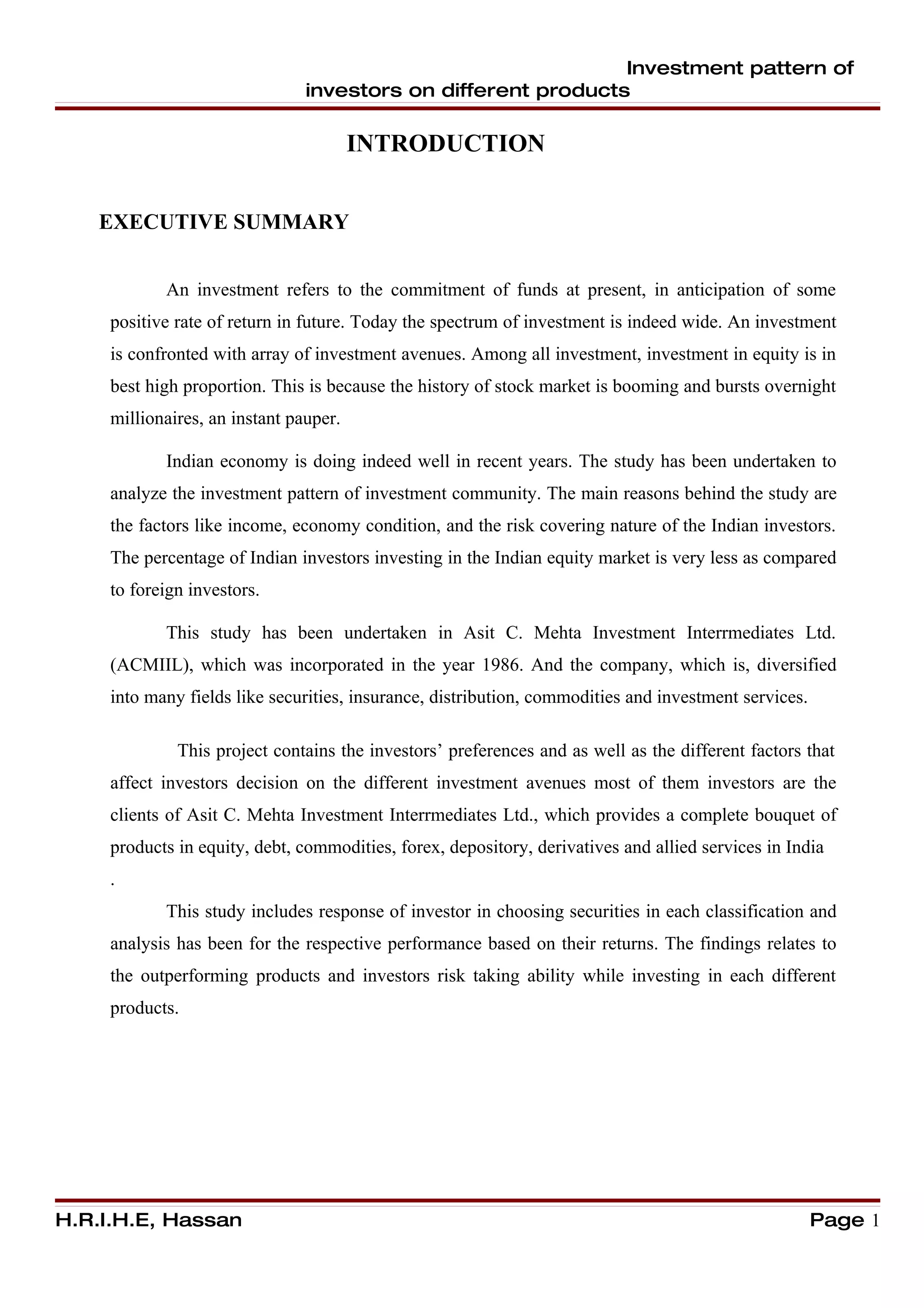 The document analyzes the investment pattern of investors in India, focusing on their preferences for different financial products, particularly equity, and the factors influencing their investment decisions such as income and economic conditions. It highlights the limited participation of Indian investors in the equity market compared to foreign investors and investigates the role of Asit C. Mehta Investment Intermediates Ltd. in providing investment services. A descriptive research methodology is employed with a sample of 50 respondents, exploring their risk tolerance and investment choices.