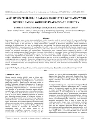 This study analyzes push-pull activities associated with awkward postures among workers in the aerospace industry, focusing on their impact on potential back pain. It identified the maximum acceptable forces for pushing (433.942 N) and pulling (396.691 N), revealing that pushing is more sustainable than pulling, while the comfort level of postures was assessed using RULA scoring, yielding a discomfort level of 7. The findings suggest significant ergonomic risks due to the nature and duration of these tasks, highlighting the need for improved workplace ergonomics.