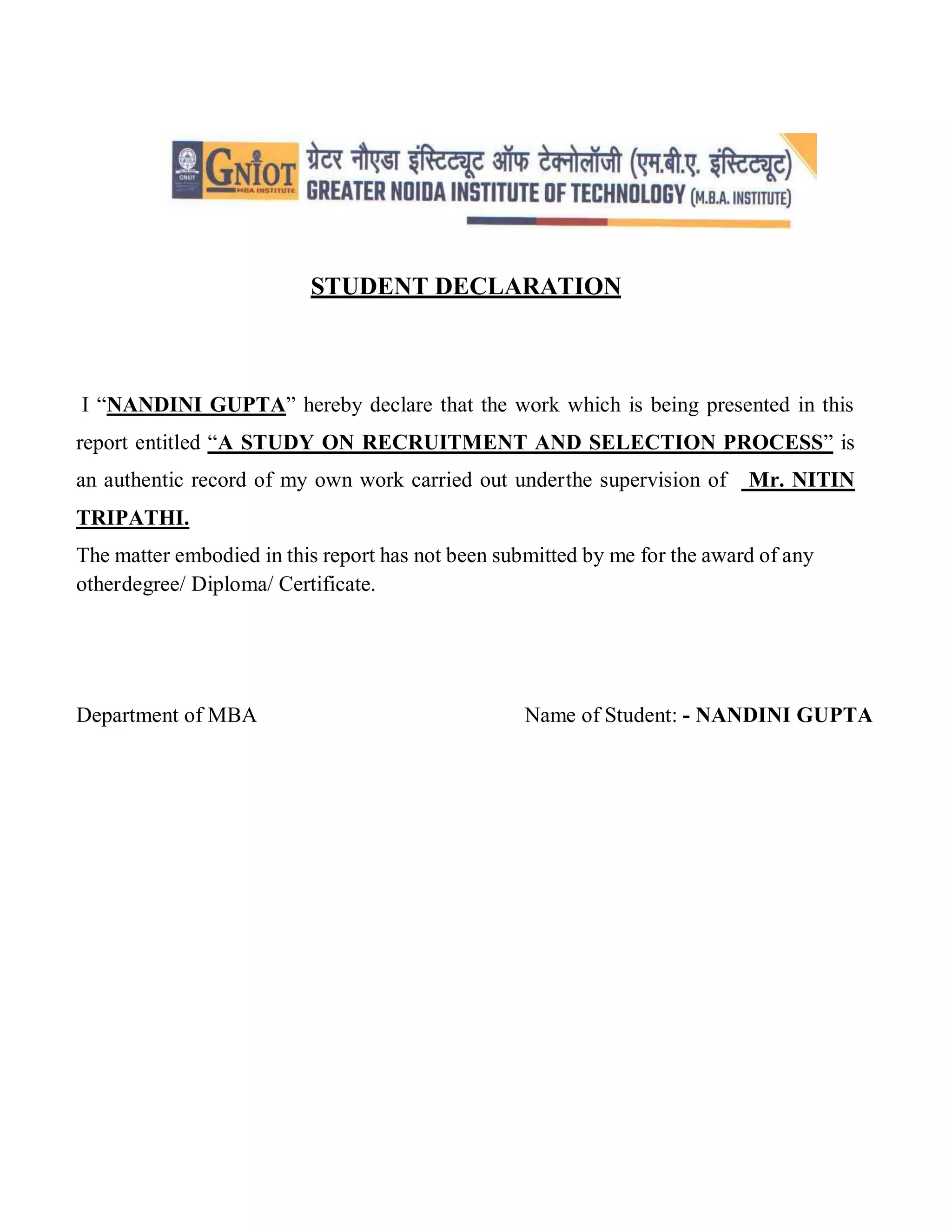 This document provides an overview of Nandini Gupta's research project report on recruitment and selection processes. The report was submitted in partial fulfillment of an MBA degree under the guidance of Mr. Nitin Tripathi.