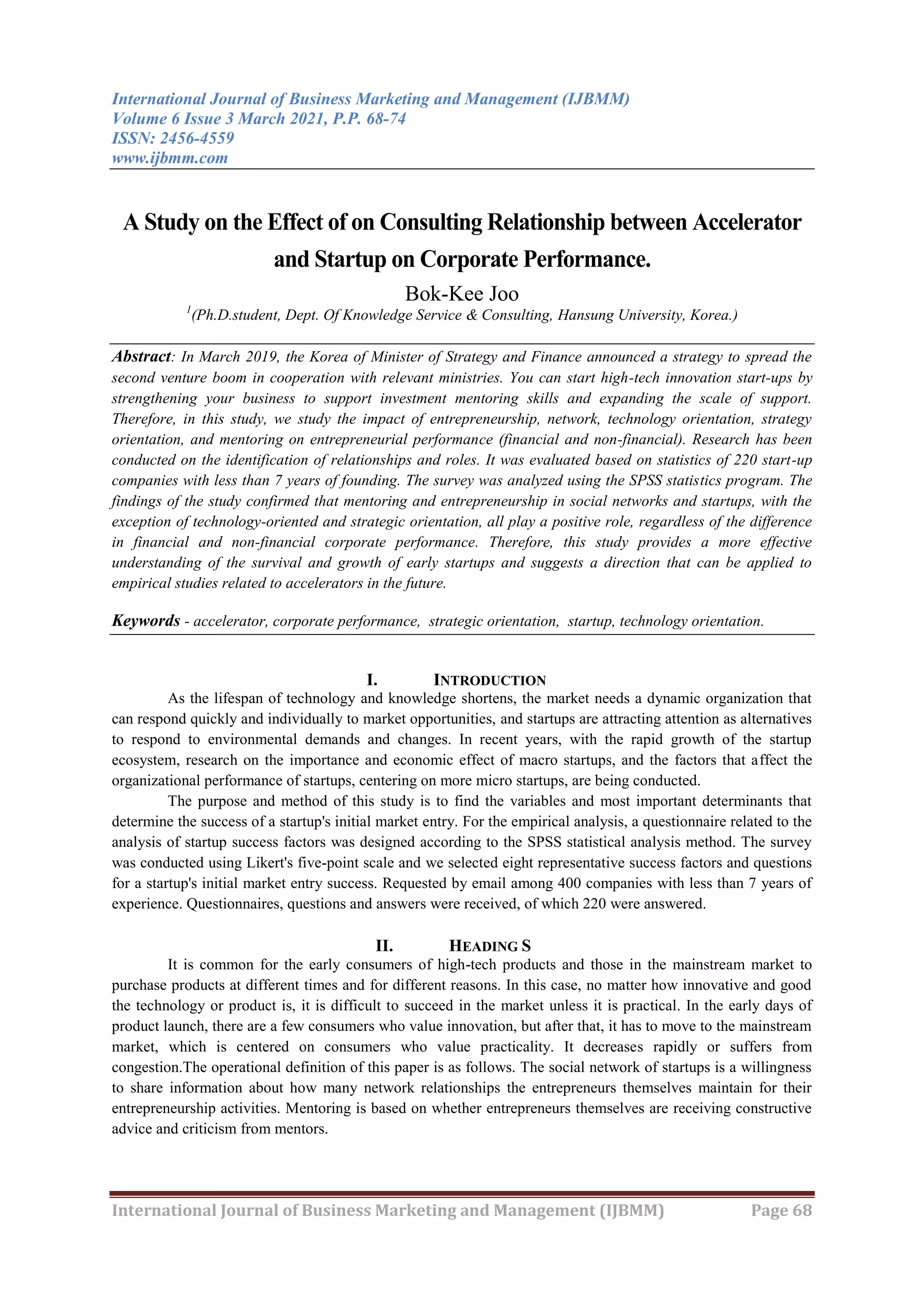 This study investigates the impact of various factors such as mentoring, entrepreneurship, and strategic and technology orientation on the corporate performance of startups in South Korea. Analyzing data from 220 startups, the findings indicate that mentoring and entrepreneurship, along with technology and strategic orientations, positively influence both financial and non-financial performance outcomes. The research aims to enhance understanding and provide insights for future studies related to accelerator programs and startup sustainability.