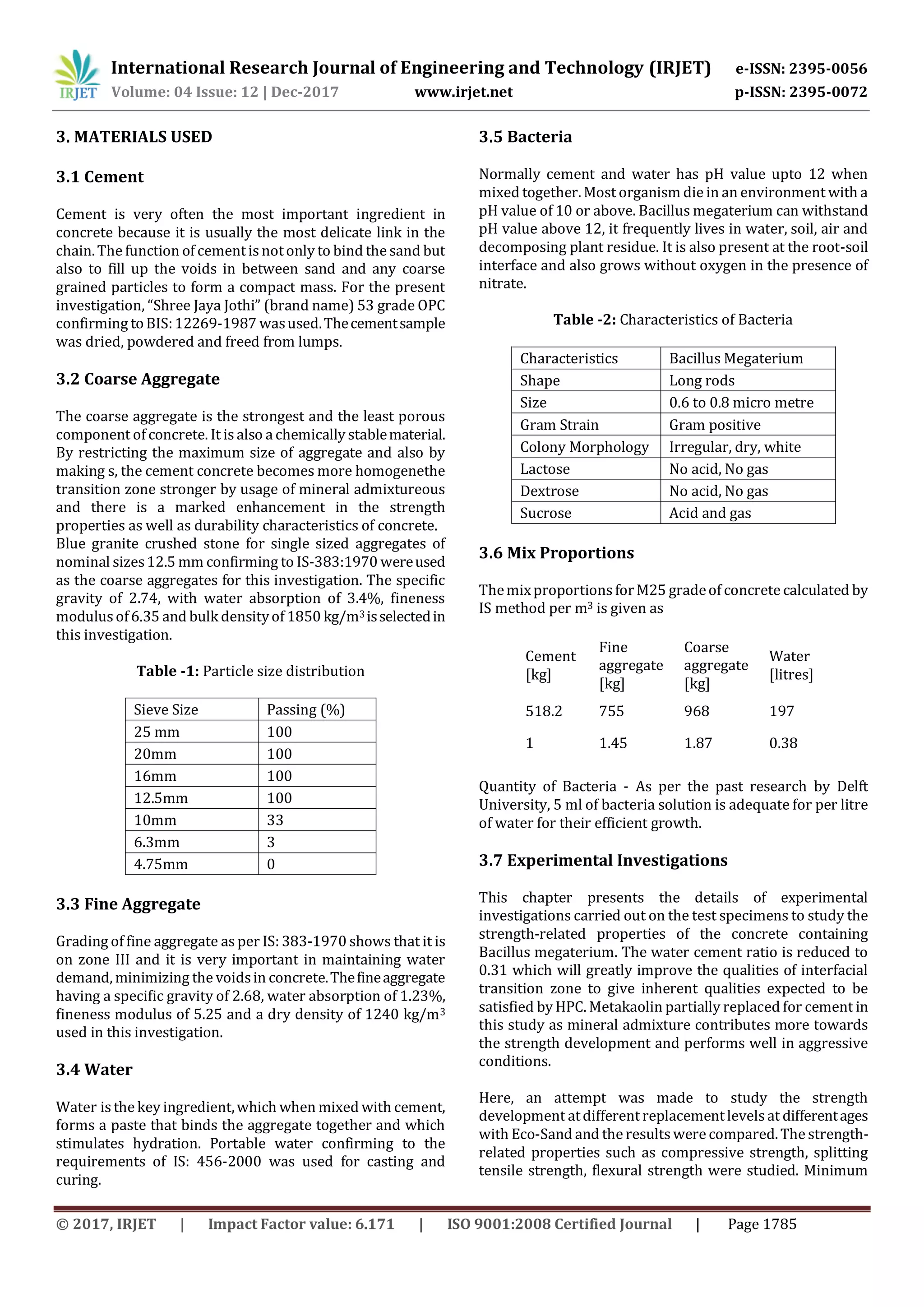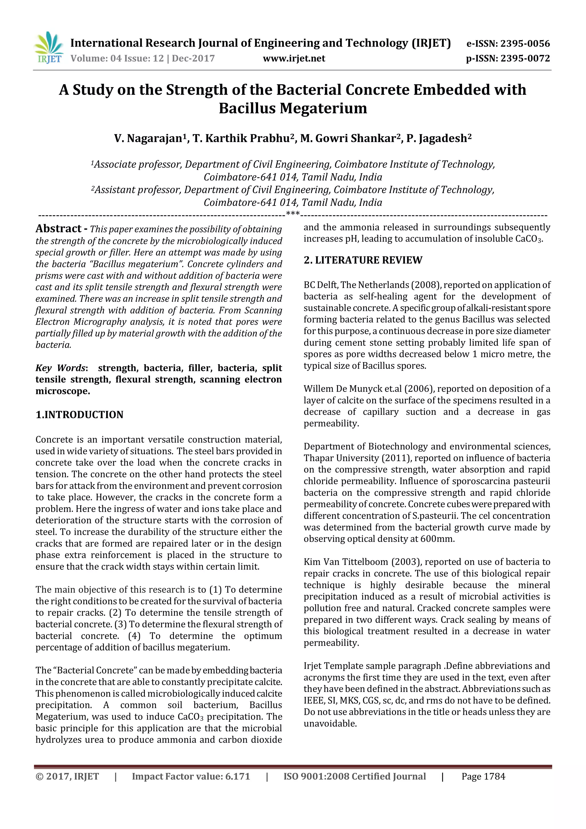 This document summarizes a study on how adding the bacteria Bacillus megaterium to concrete affects its strength properties. Concrete cylinders and prisms were cast with and without the bacteria. Testing found that adding the bacteria led to increases in both the split tensile strength and flexural strength of the concrete. Scanning electron microscope analysis indicated that pores in the concrete were partially filled by material growth from the addition of the bacteria. The maximum compressive strength was achieved with a bacteria cell concentration of 105 cells per ml of mixing water. Overall, the addition of B. megaterium was found to significantly improve the strength characteristics of concrete compared to conventional concrete without bacteria.