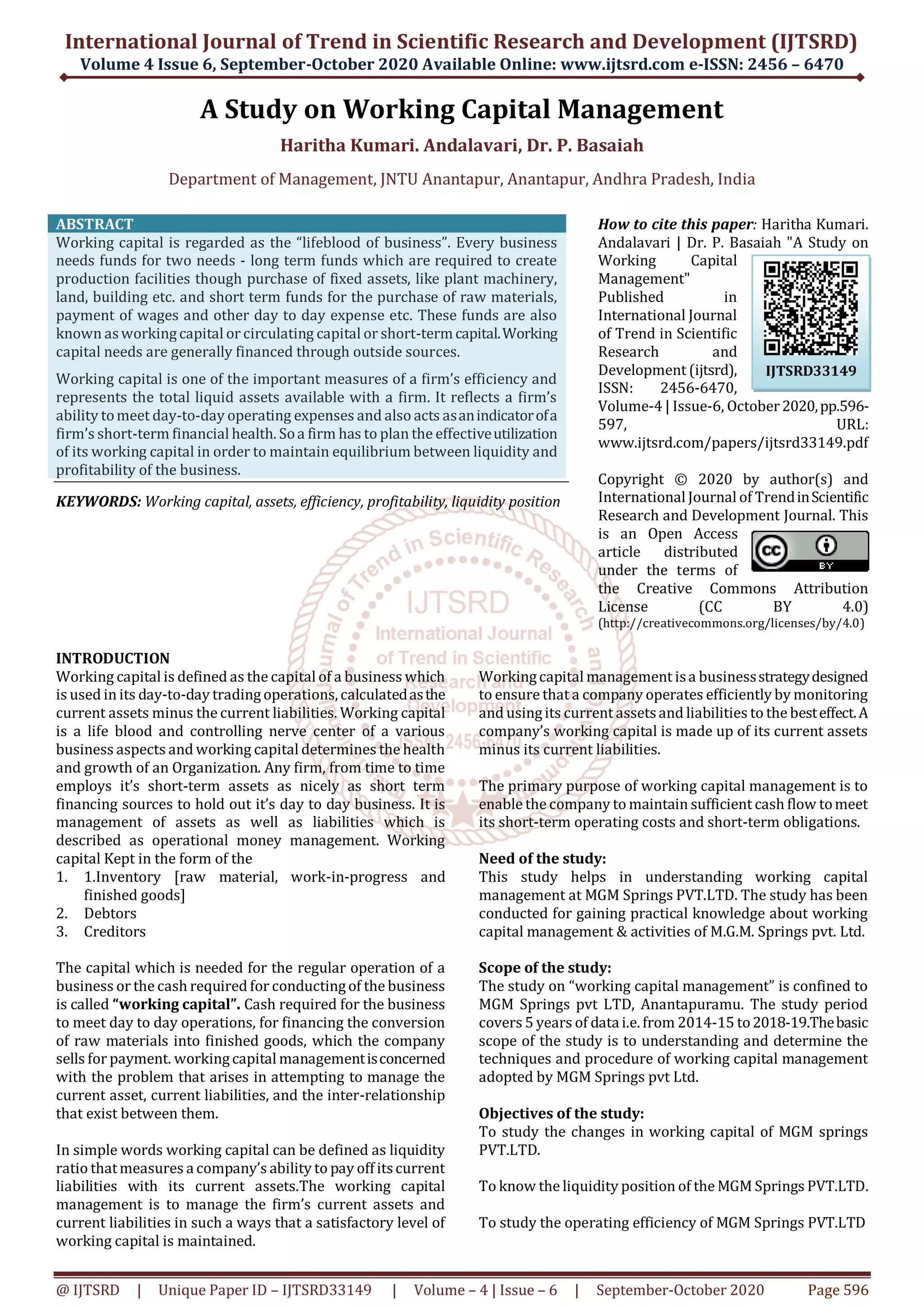 1. The document analyzes the working capital management of MGM Springs PVT LTD over a 5-year period from 2014-2019.