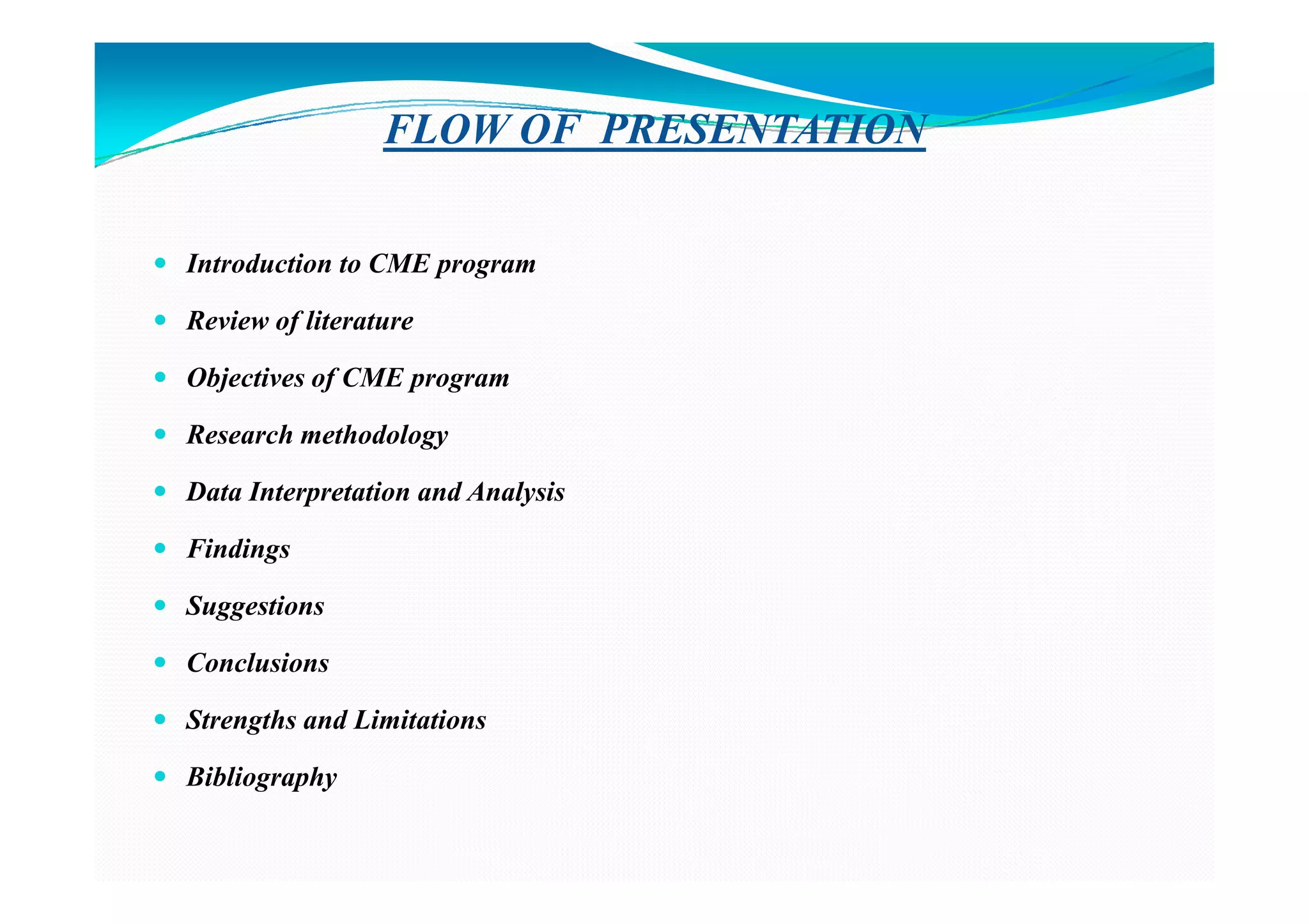 This document outlines a project on continuing medical education (CME) programs presented by Bhavik Amin. It includes an introduction to CME programs, a review of relevant literature on effective CME techniques, objectives of CME programs, the research methodology used, an analysis of survey data collected from 36 doctors, findings from the data, suggestions to improve CME programs, conclusions, strengths and limitations of the study, and a bibliography. The project aimed to understand doctors' expectations of CME programs organized by pharmaceutical companies.