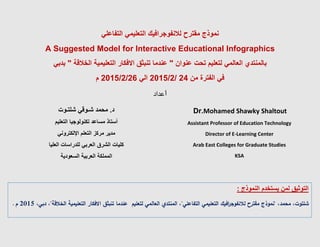 This document proposes a model for creating interactive educational infographics. It describes the design, production, evaluation, and application processes. The key steps include analyzing learner characteristics and educational needs, designing layout and visual elements, producing an initial model using graphic software, revising for technical and linguistic accuracy, applying it to a test group, and finalizing after evaluative assessment. The goal is to visually present scientific content in a way that is easily understood.