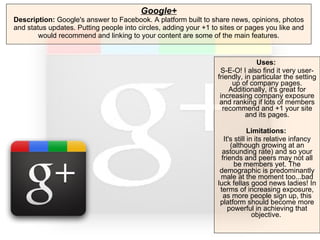 The document provides an overview of ten popular social media platforms, including Google+, Twitter, LinkedIn, Facebook, IFTTT, YouTube, Foursquare, StumbleUpon, Pinterest, and About.me. Each platform is described in terms of its features, uses for individuals or businesses, and limitations. The guide serves as a simple resource for understanding the current landscape of social media and how these platforms can be utilized effectively.