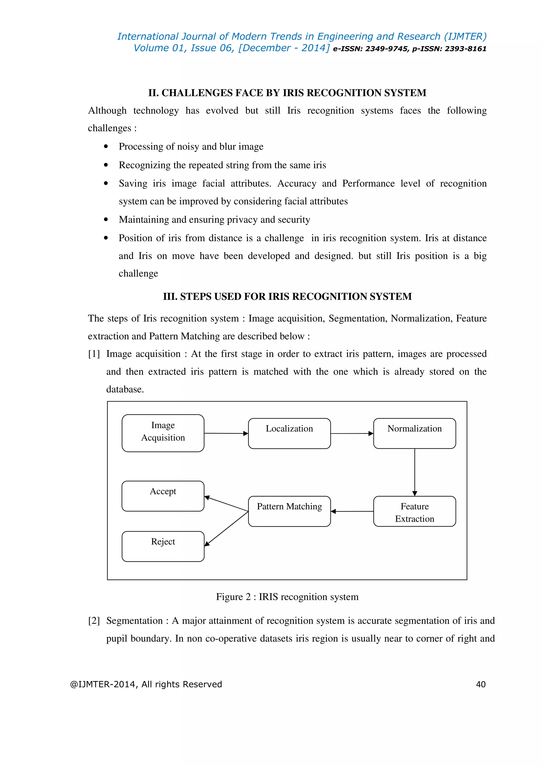 The document presents a comprehensive survey of iris-based recognition systems, emphasizing their reliability and accuracy as a security measure. It discusses various techniques for iris feature extraction, segmentation, and pattern matching, along with the challenges faced by these systems. Future work aims to improve the proposed methodologies and extend them to multimodal biometric systems.