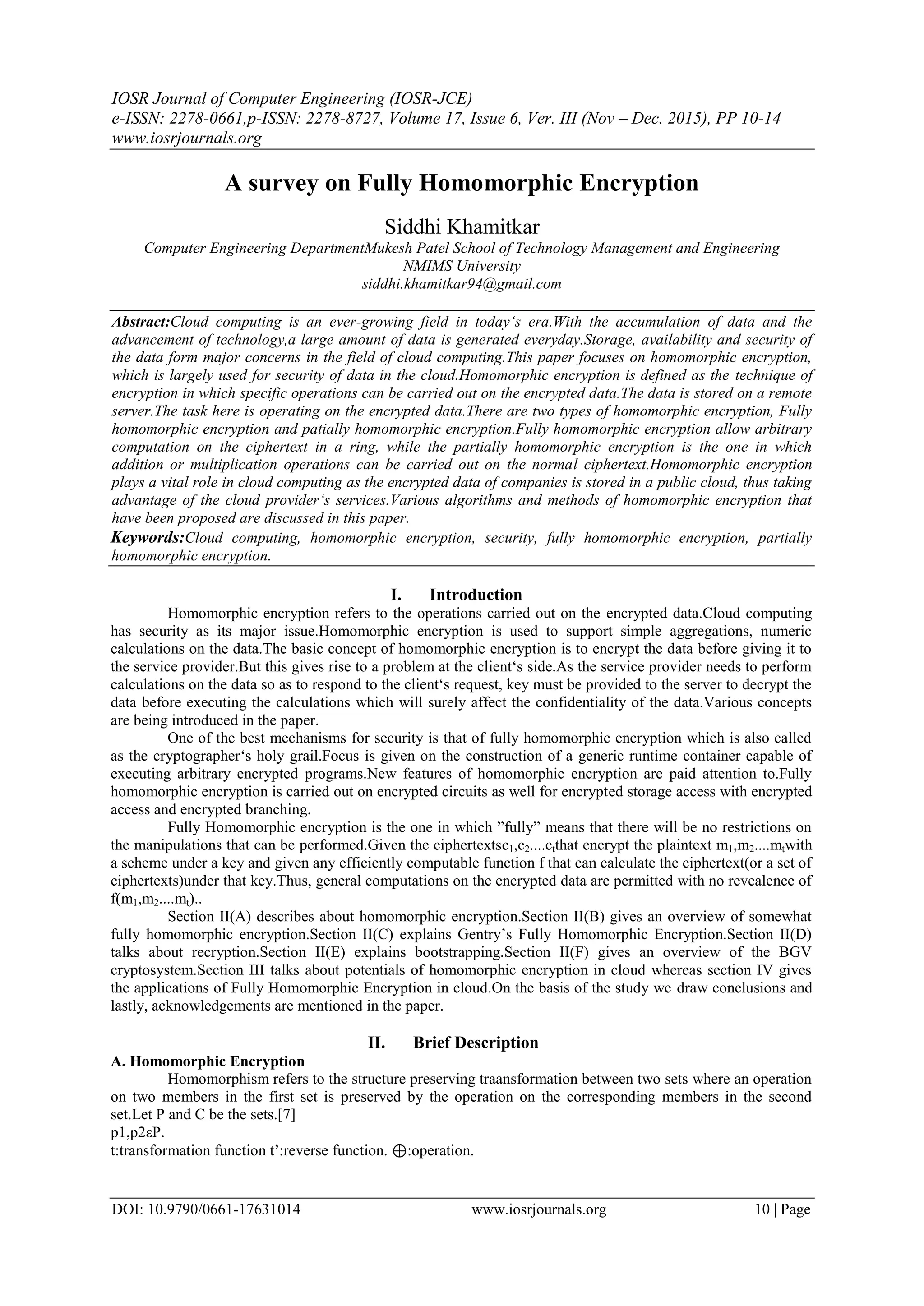 This paper surveys fully homomorphic encryption (FHE), a crucial technique for ensuring data security in cloud computing by enabling operations on encrypted data without needing to decrypt it. It discusses the distinctions between fully and partially homomorphic encryption, various algorithms including Gentry's method, and highlights the potential and applications of FHE in cloud environments. The research emphasizes the importance of FHE in maintaining data confidentiality while utilizing cloud services.