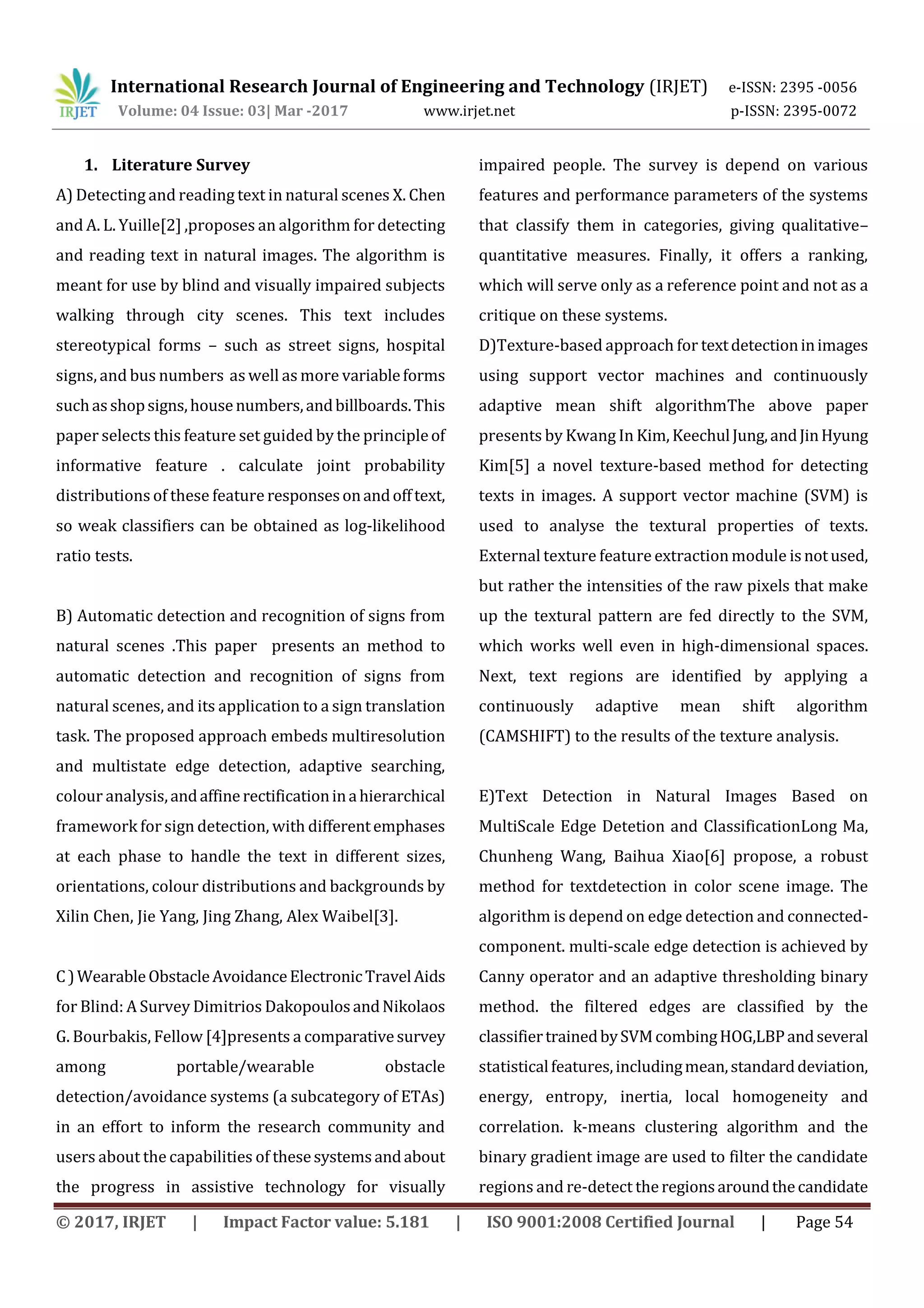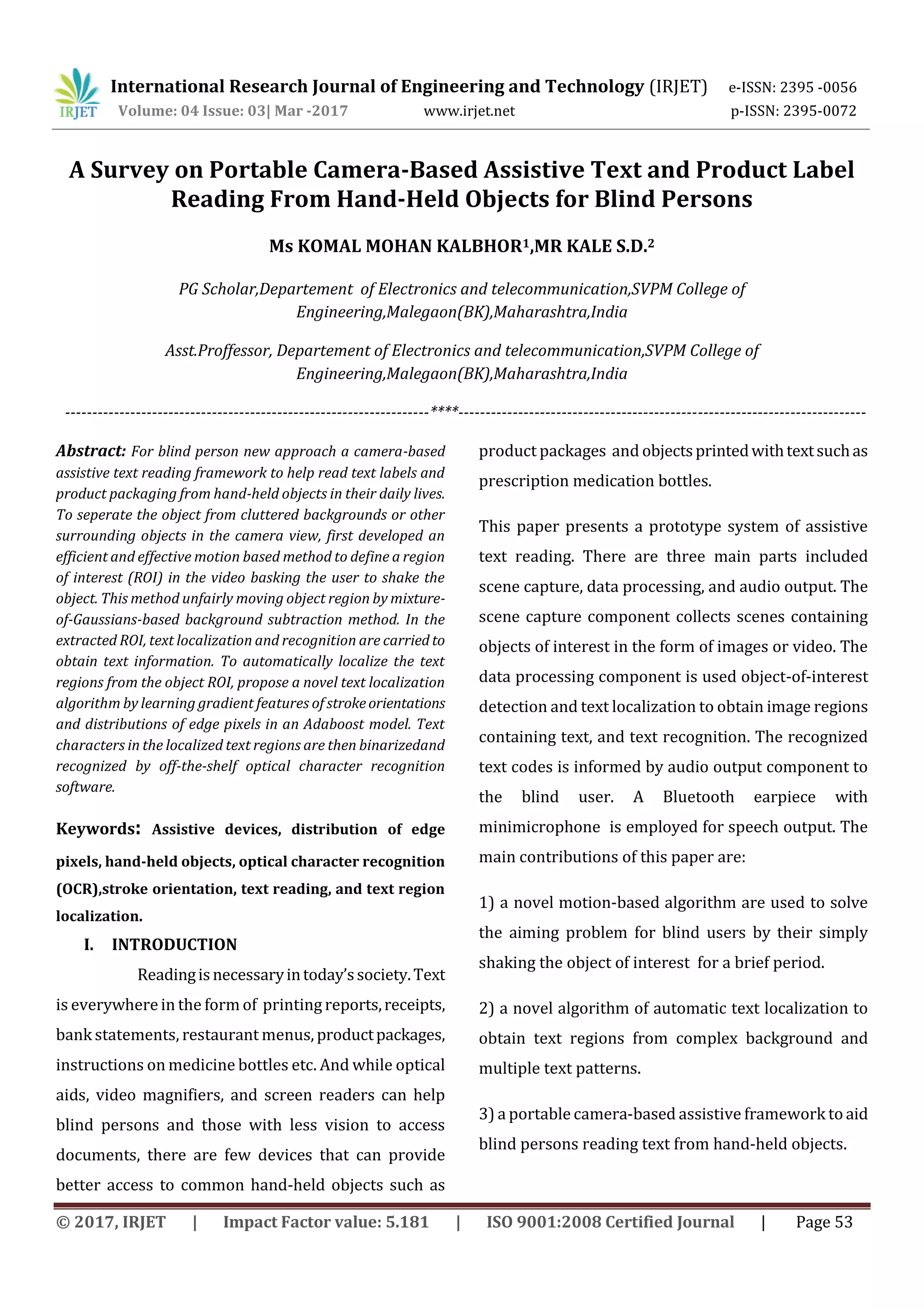 This document presents a survey of existing portable camera-based assistive text and product label reading systems for blind persons. It proposes a new framework that uses motion-based targeting to isolate the object of interest and a novel text localization algorithm combining gradient features and edge pixel distributions to automatically locate and recognize text. The system is designed to help blind persons read text labels on hand-held objects in their daily lives through a portable camera, data processing components, and audio output via Bluetooth earpiece. It aims to provide better independent access to common objects like medication bottles than existing optical aids and screen readers.