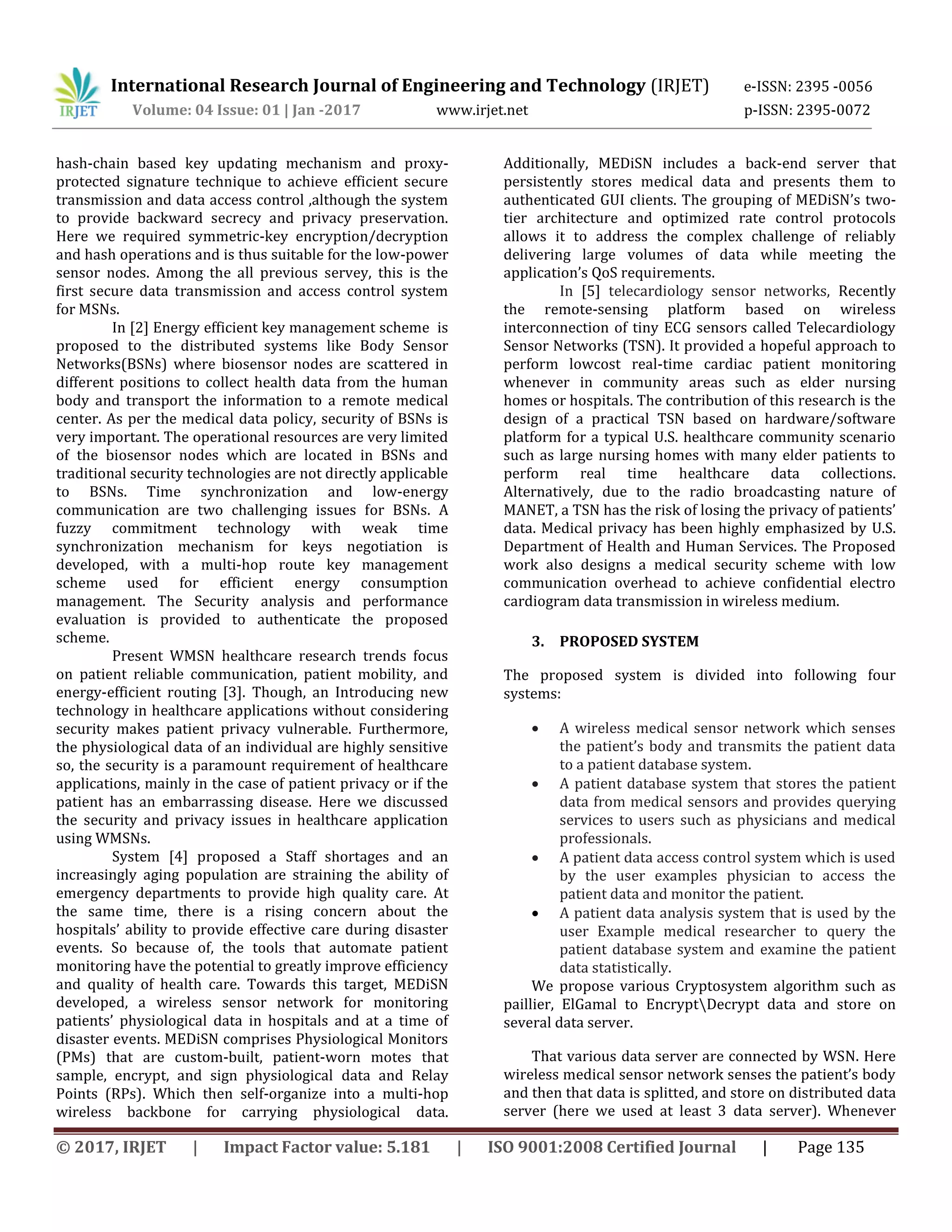 This document summarizes a survey on providing security for wireless medical sensor data. The survey examines existing approaches that use cryptosystems like Paillier and ElGamal to securely distribute patient data across multiple data servers. This prevents privacy compromises if a single data server is breached. The proposed system would use these cryptosystems to encrypt patient data captured by wireless medical sensors and split the encrypted data across several data servers. This would allow analysis of patient data without compromising privacy as long as not all servers are compromised.
