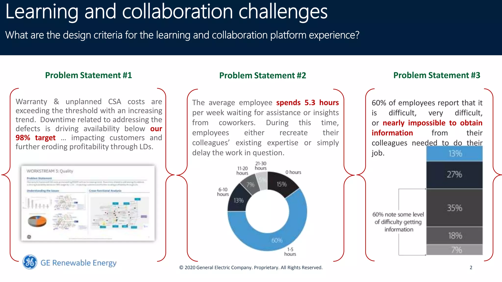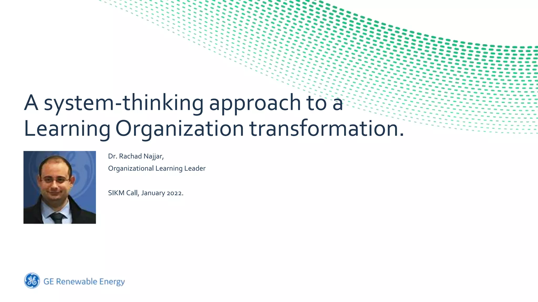 The document discusses building a learning organization at GE Renewables. It outlines several challenges related to learning and collaboration. It then describes a multi-phase approach to transforming the organization into a learning organization where leadership is committed to learning, problems are solved collectively, and new expertise is developed. Finally, it discusses components of the learning organization operating model including expertise development, problem solving capacity, and knowledge sharing communities.
