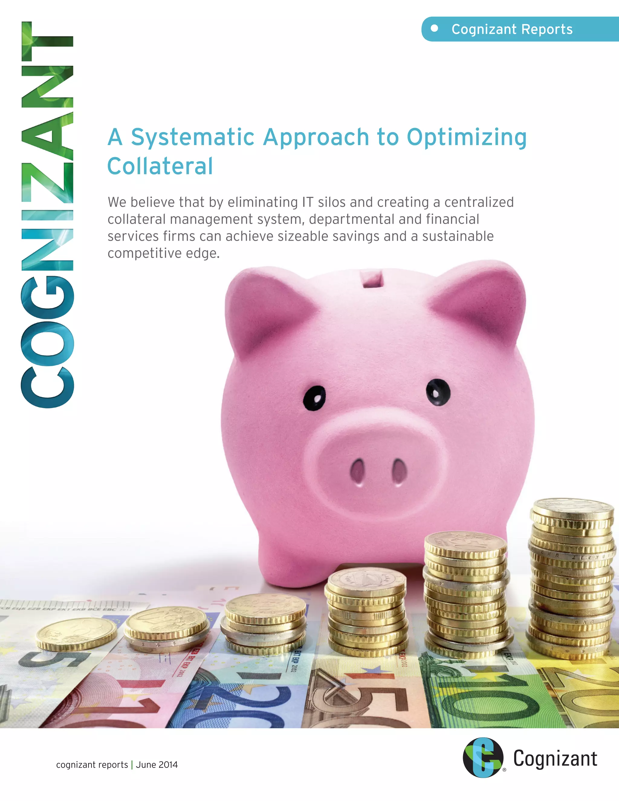 The document discusses establishing a robust collateral management and optimization infrastructure. It outlines that creating centralized collateral management can achieve savings of $1-4 billion annually by eliminating silos. Currently, operational silos and lack of standardized data hinder optimal collateral usage. The document recommends a three-pronged approach: 1) create a central agency to improve efficiency by 7-10%, 2) optimize portfolios with analytical tools to gain 5-7% efficiency, and 3) use portfolio transformation techniques to address remaining shortfalls.