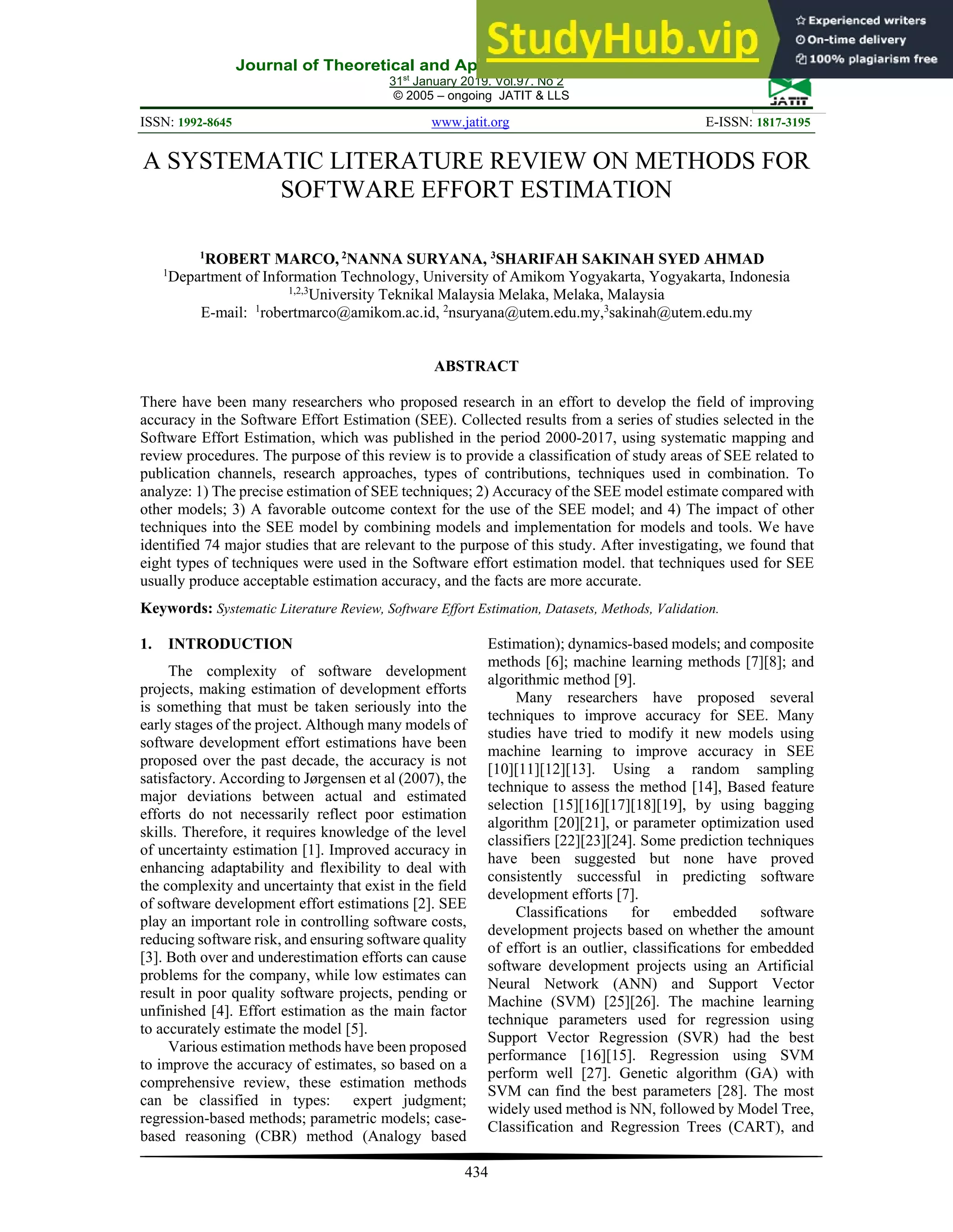 This document summarizes a systematic literature review on methods for software effort estimation. It identifies 74 relevant studies published between 2000-2017. The studies are classified based on publication channels, research approaches, contribution types, and techniques used. The review finds that eight types of techniques are commonly used for software effort estimation, including expert judgment, regression-based methods, and machine learning methods. It also analyzes factors that impact estimation accuracy, such as dataset quality, feature selection, and parameter optimization. The goal of the review is to provide an overview of the software effort estimation field and techniques used to improve accuracy.