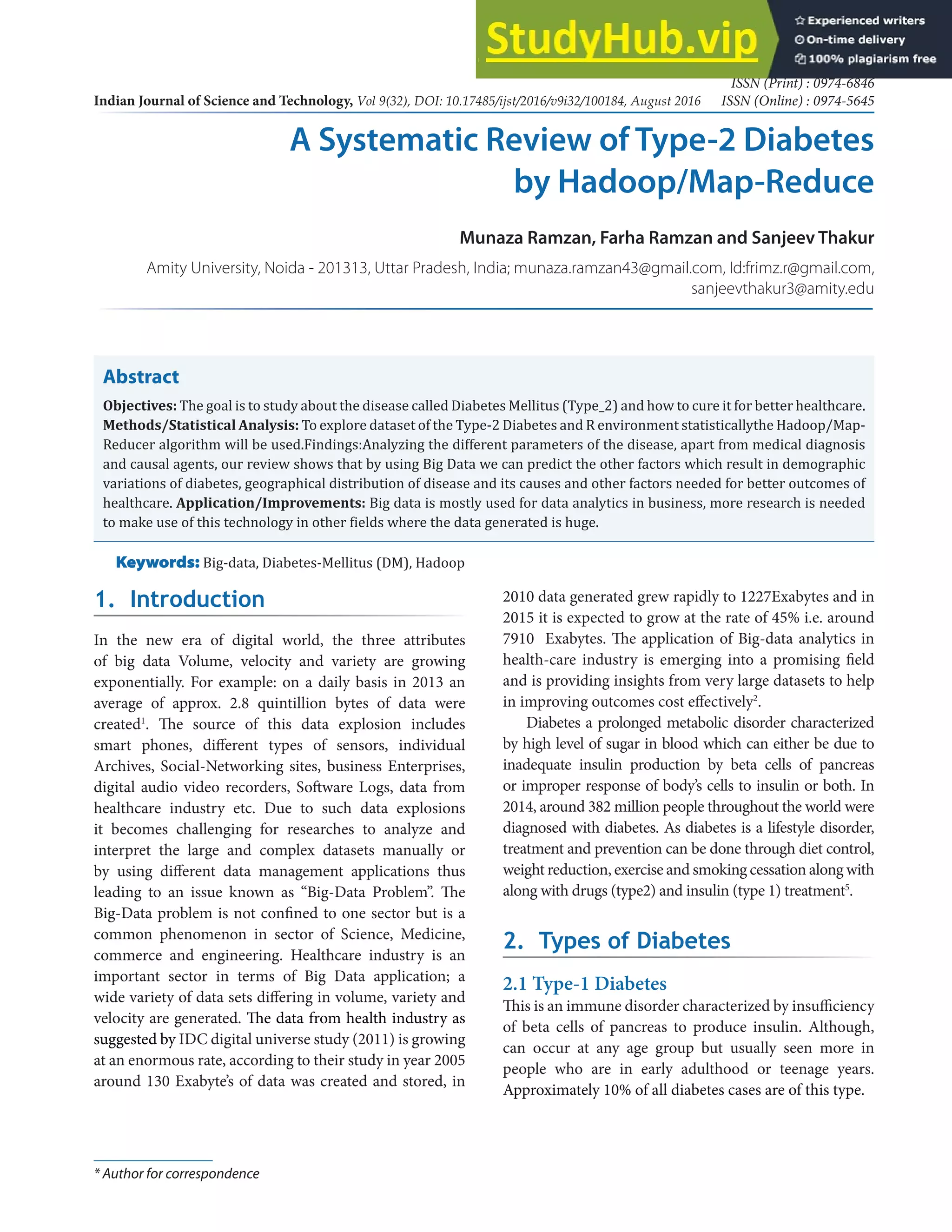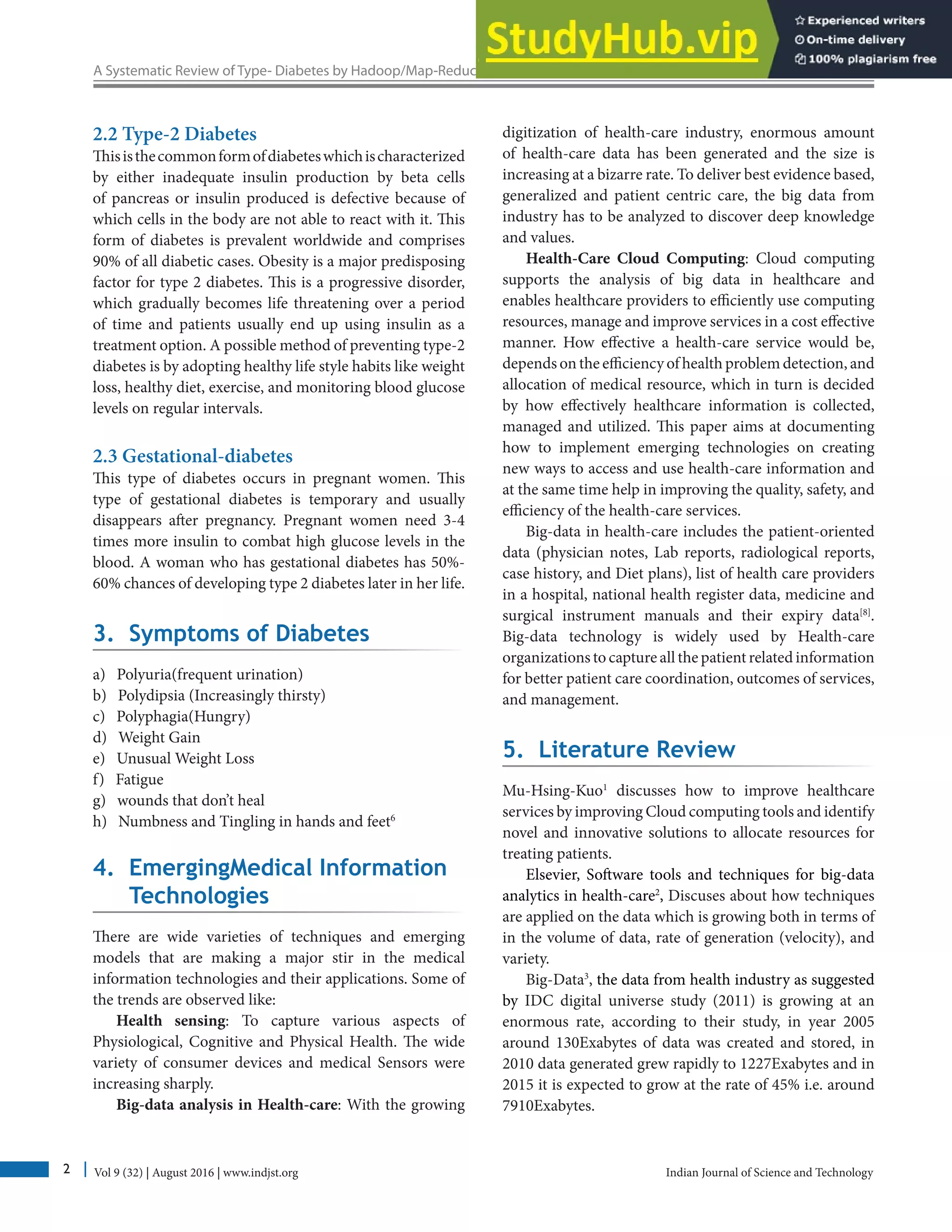 This document summarizes a systematic review of using Hadoop/MapReduce algorithms to analyze big data related to type 2 diabetes. It first provides background on the growing issue of big data in healthcare. It then reviews literature discussing how big data analytics and cloud computing can improve healthcare services and outcomes by more effectively collecting, managing, and using healthcare information. The review focuses on analyzing different parameters of type 2 diabetes using big data to better understand demographic and geographic variations in the disease and identify other factors impacting healthcare outcomes.