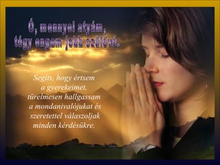 Tégy engem igazságossá,igazzá és béketűrővé . Ó, Uram, add, hogy a gyerekeim becsüljenek engem, szeressenek és utánozzanak . Amen. — Abigail Van Buren (1918– ), "Dear Abby" www.tommyswindow.com További PowerPoint prezetációkat itt talál : KÜLDJE TOVÁBB!
