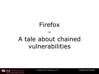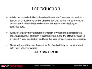 The document discusses multiple issues and vulnerabilities in the Firefox web browser, including issues with JavaScript, secrets, symlinks, and an exploit repository. It covers constraints and solutions to these technical problems, as well as results and short summaries. The overall topic is an introduction to analyzing vulnerabilities in Firefox through a forensic analysis lab.