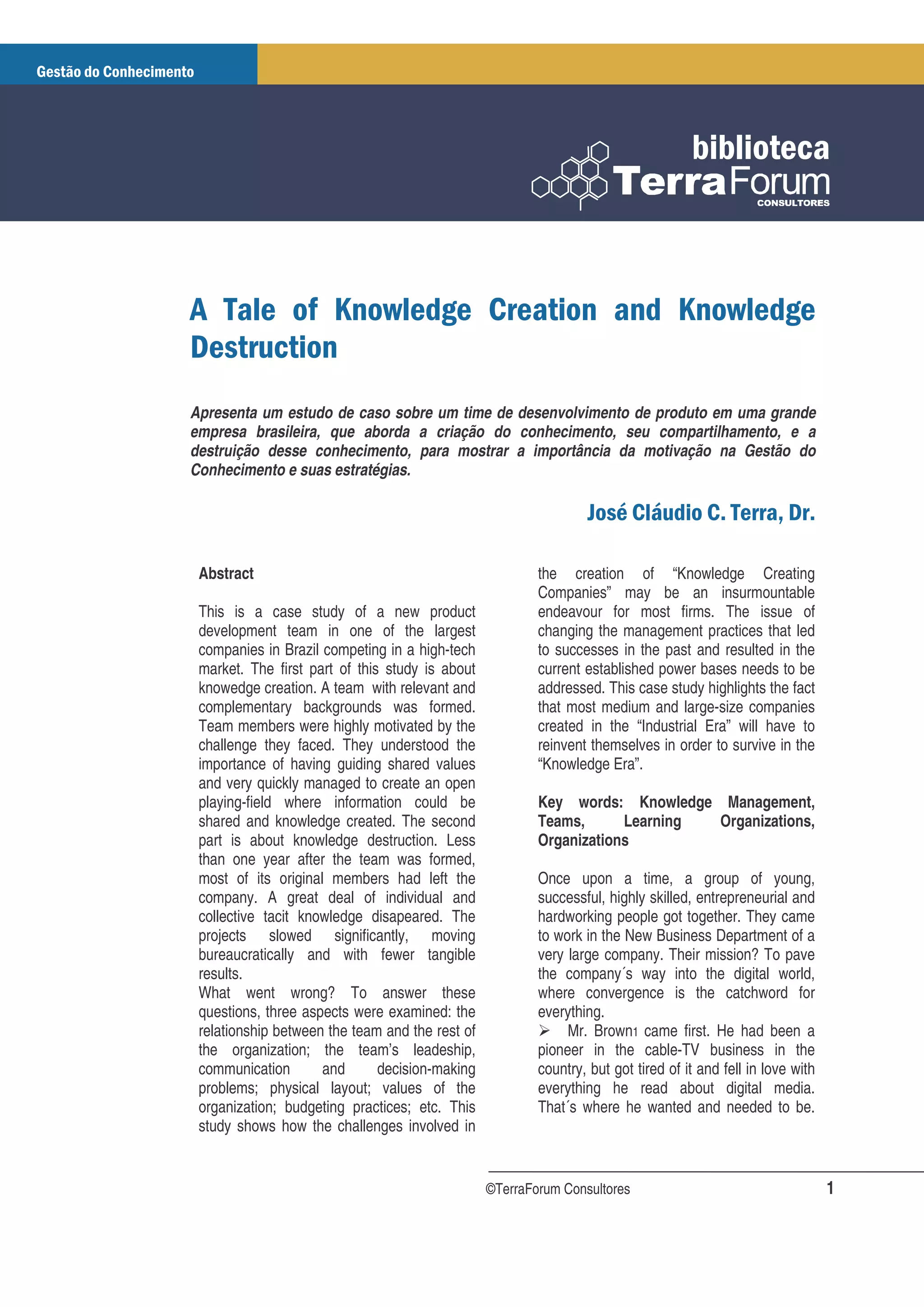 This document presents a case study on a product development team in a large Brazilian company, highlighting the importance of knowledge creation, sharing, and destruction amidst challenges faced due to the company's bureaucratic management practices. The study reveals that motivation and shared values among team members initially fostered innovation but led to knowledge loss and reduced efficiency as key members departed. Factors such as communication, leadership, and organizational structure significantly influenced the team's ability to succeed in the competitive digital market.